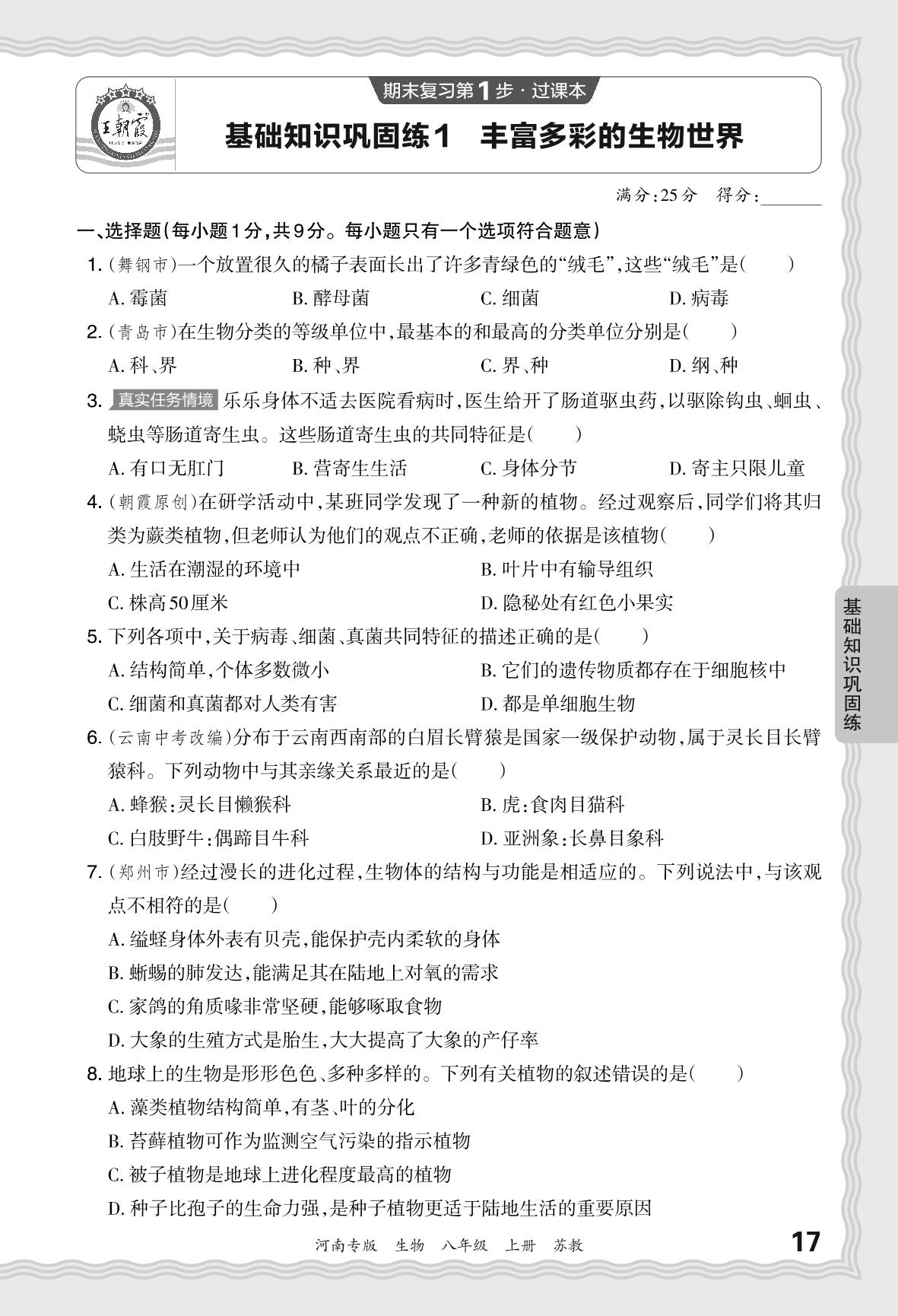 2023秋上册八年级生物苏教版 期末过课本·基础知识巩固练 丰富多彩的生物世界【1】