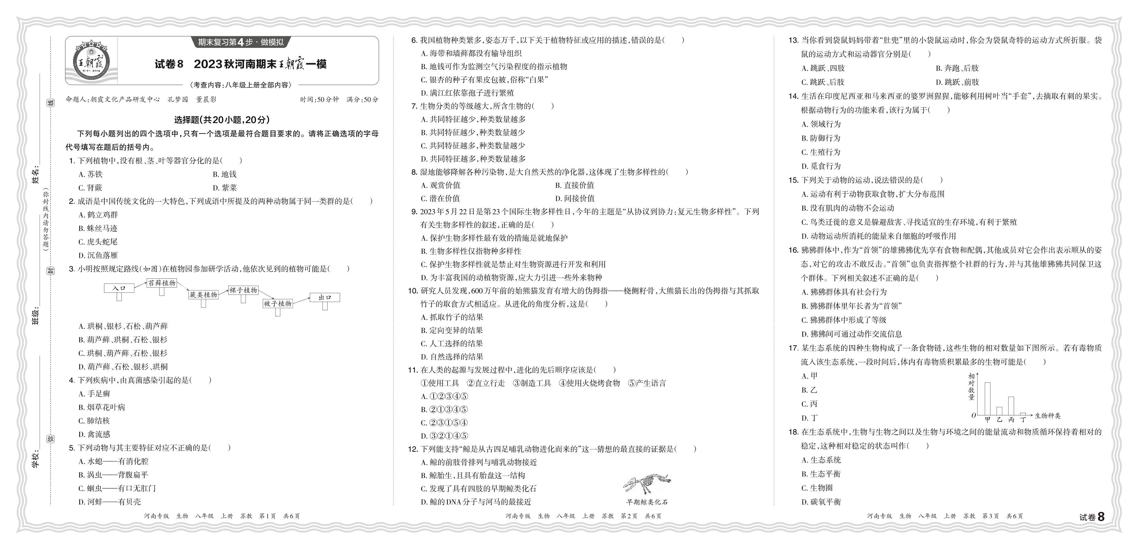 2023秋上册八年级生物苏教版 河南期末王朝霞一模