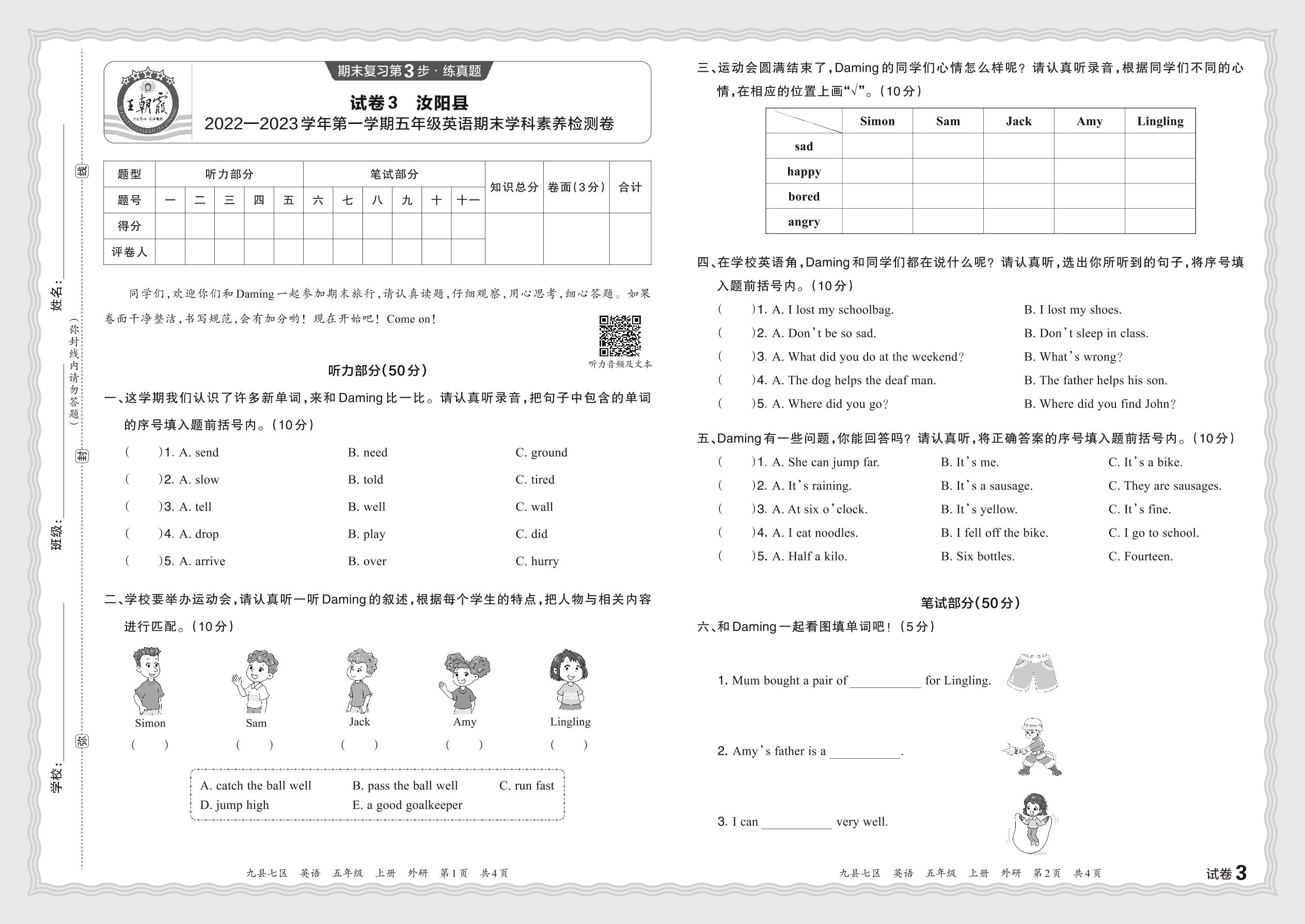 河南省洛阳市汝阳县2022—2023学年第一学期五年级英语期末学科素养检测卷(外研版)【3】