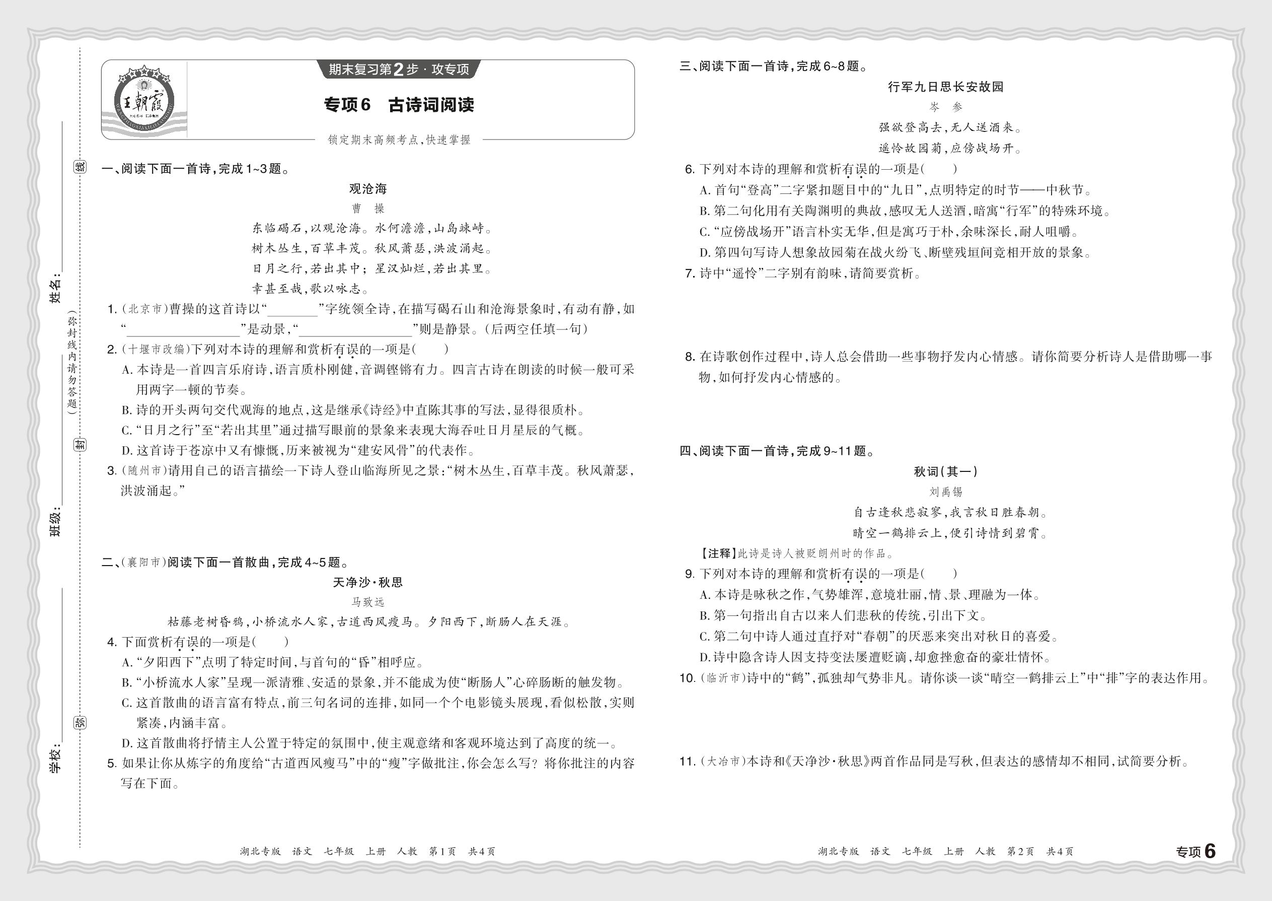 2023秋上册七年级语文人教版 期末专项卷·古诗词阅读_R231127164658310【6】