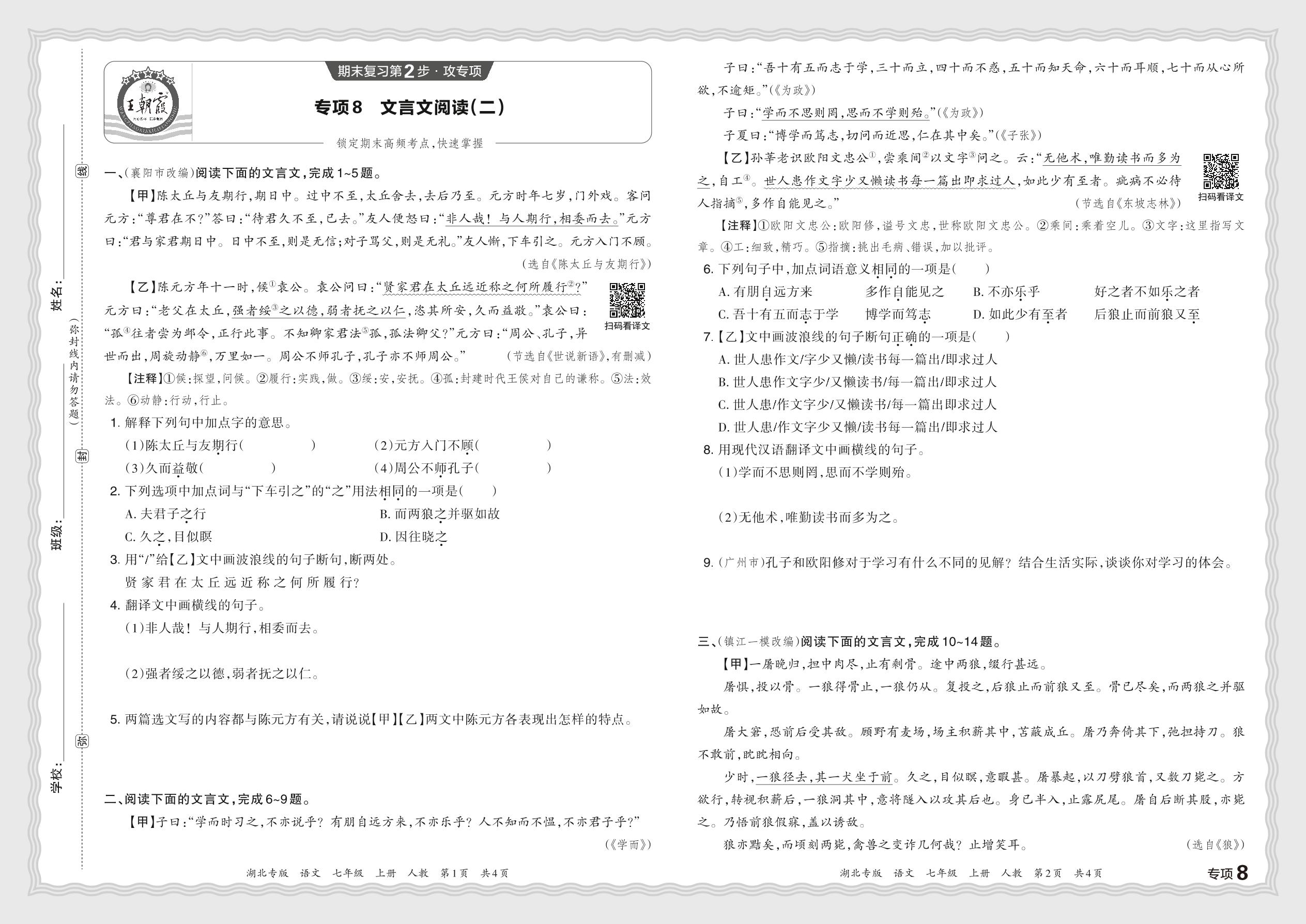 2023秋上册七年级语文人教版 期末专项卷·文言文阅读(二)【8】