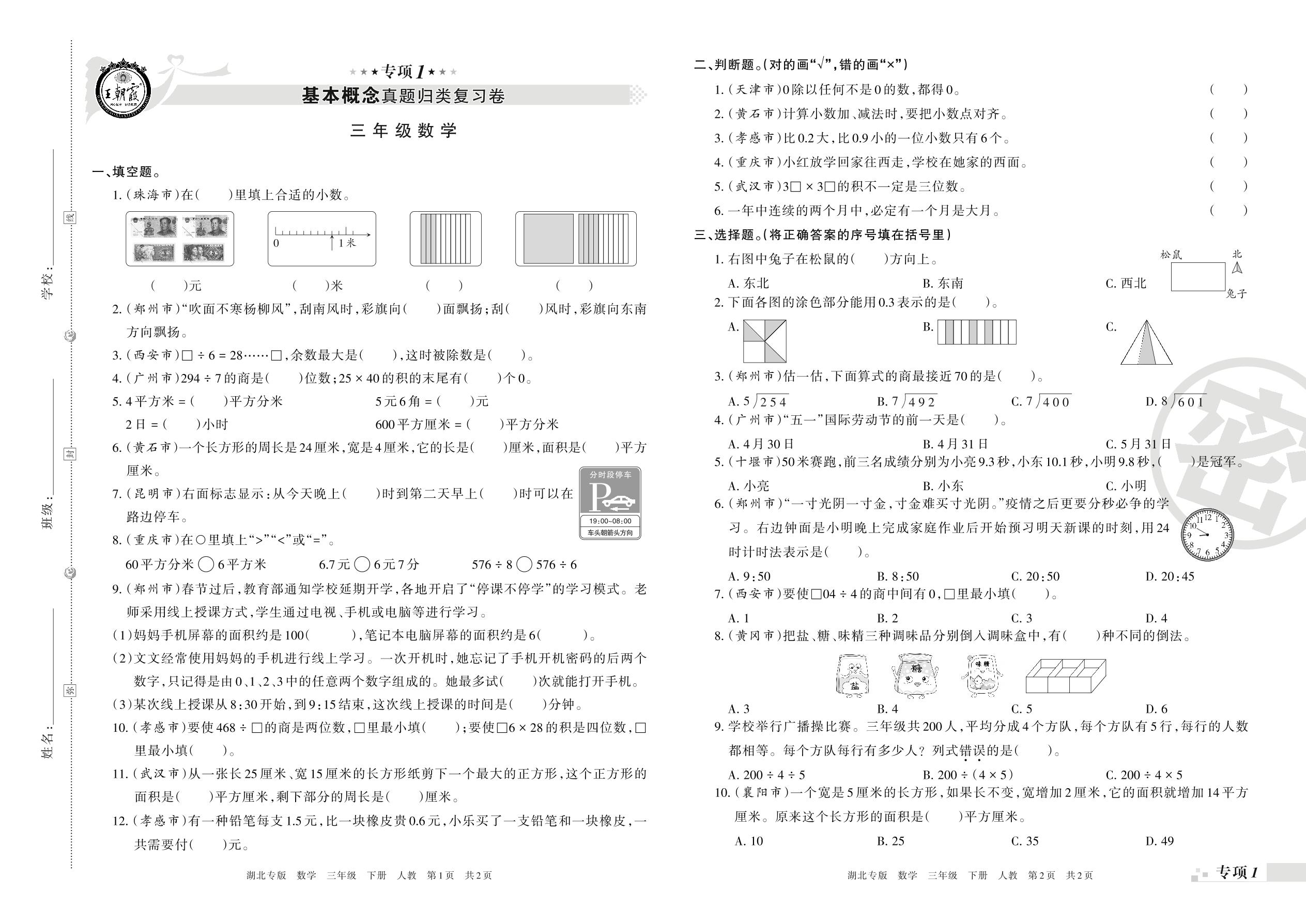 王朝霞期末专项卷——基本概念、计算真题归类复习三年级下册数学(人教版)_R21080490113【0】