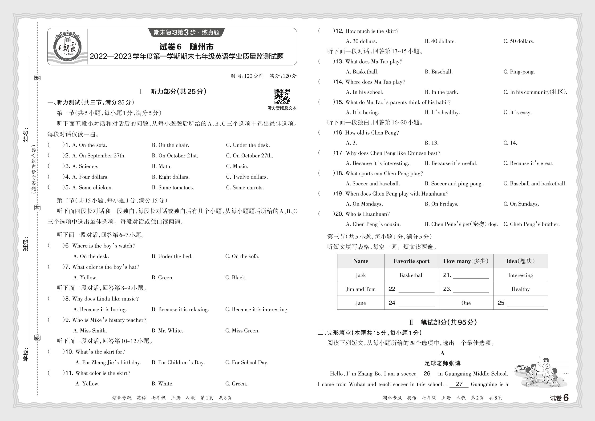 湖北省随州市2022—2023学年度第一学期期末七年级英语学业质量监测试题(人教版)【6】