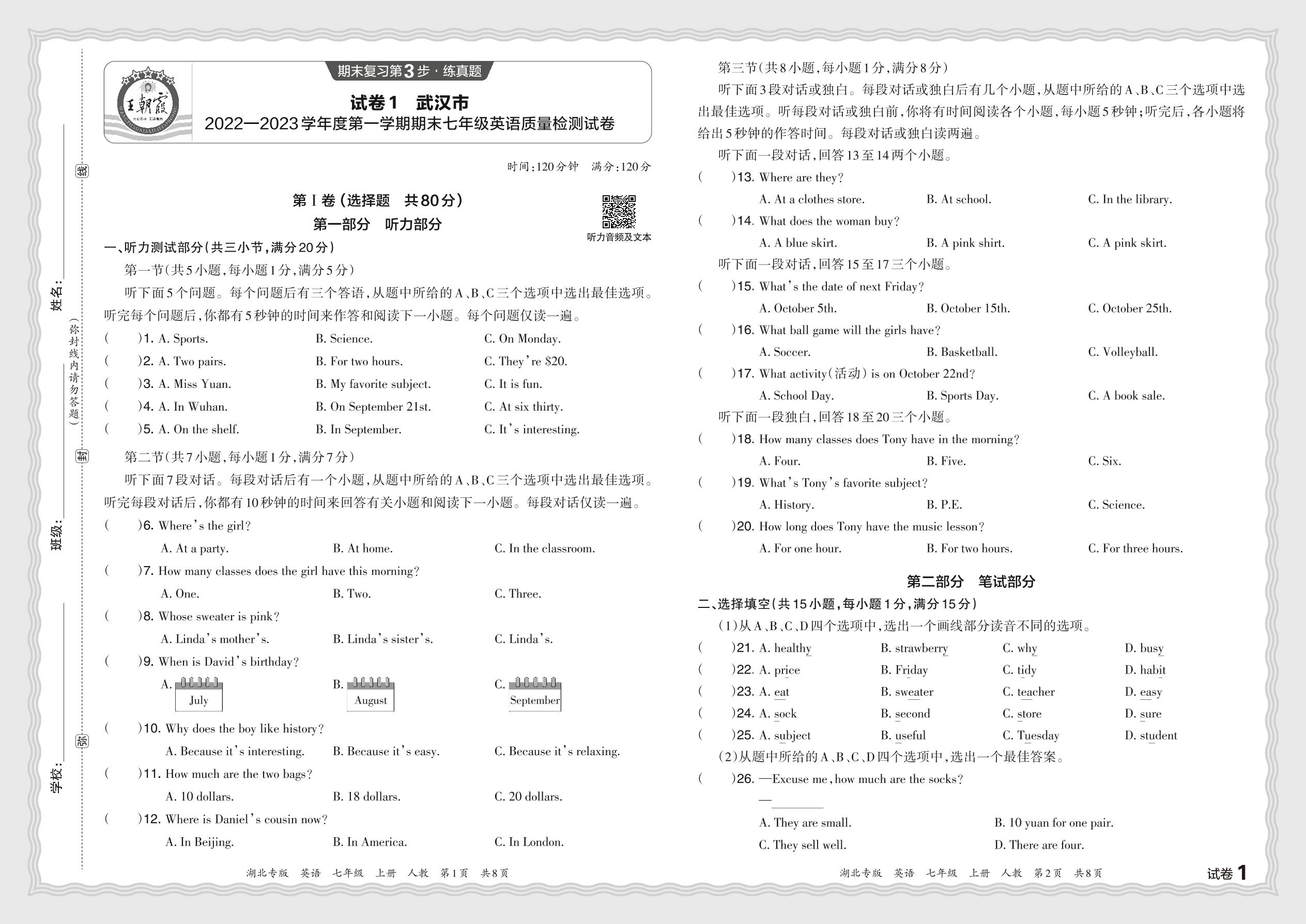 湖北省武汉市2022—2023学年度第一学期期末七年级英语质量检测试卷(人教版)【1】