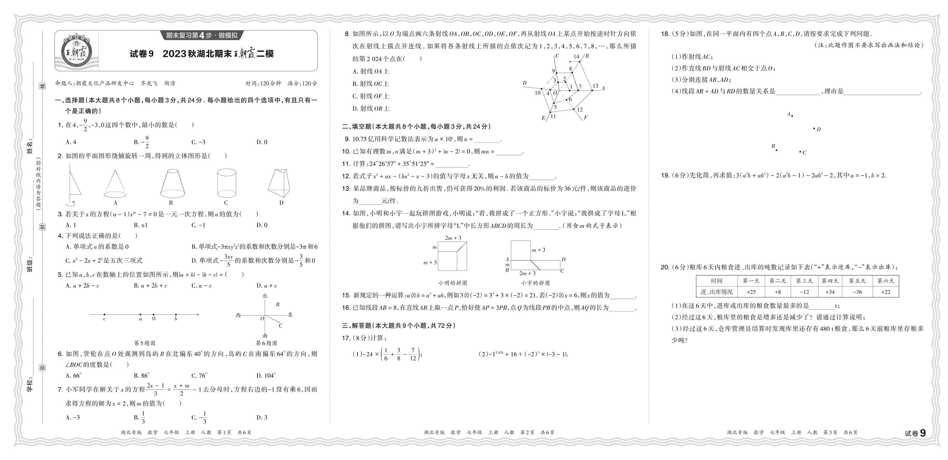 2023秋上册七年级数学人教版 湖北期末王朝霞二模