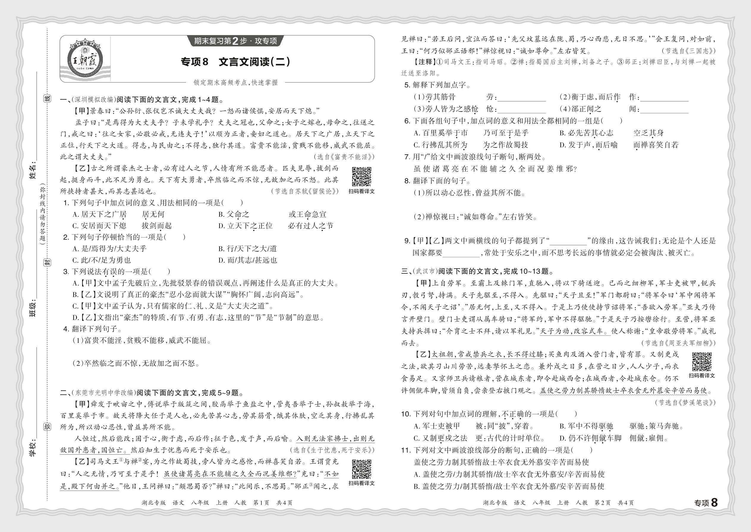 2023秋上册八年级语文人教版 期末专项卷·文言文阅读(二)【8】