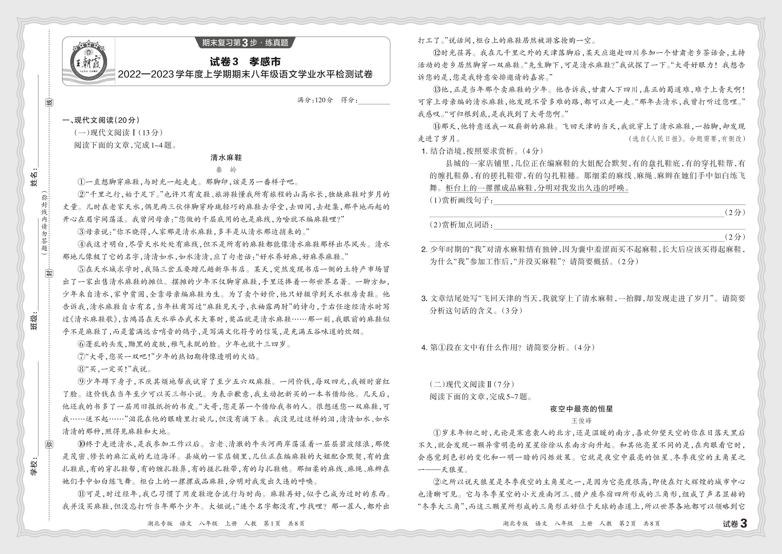 湖北省孝感市2022—2023学年度上学期期末八年级语文学业水平检测试卷(人教版)【3】
