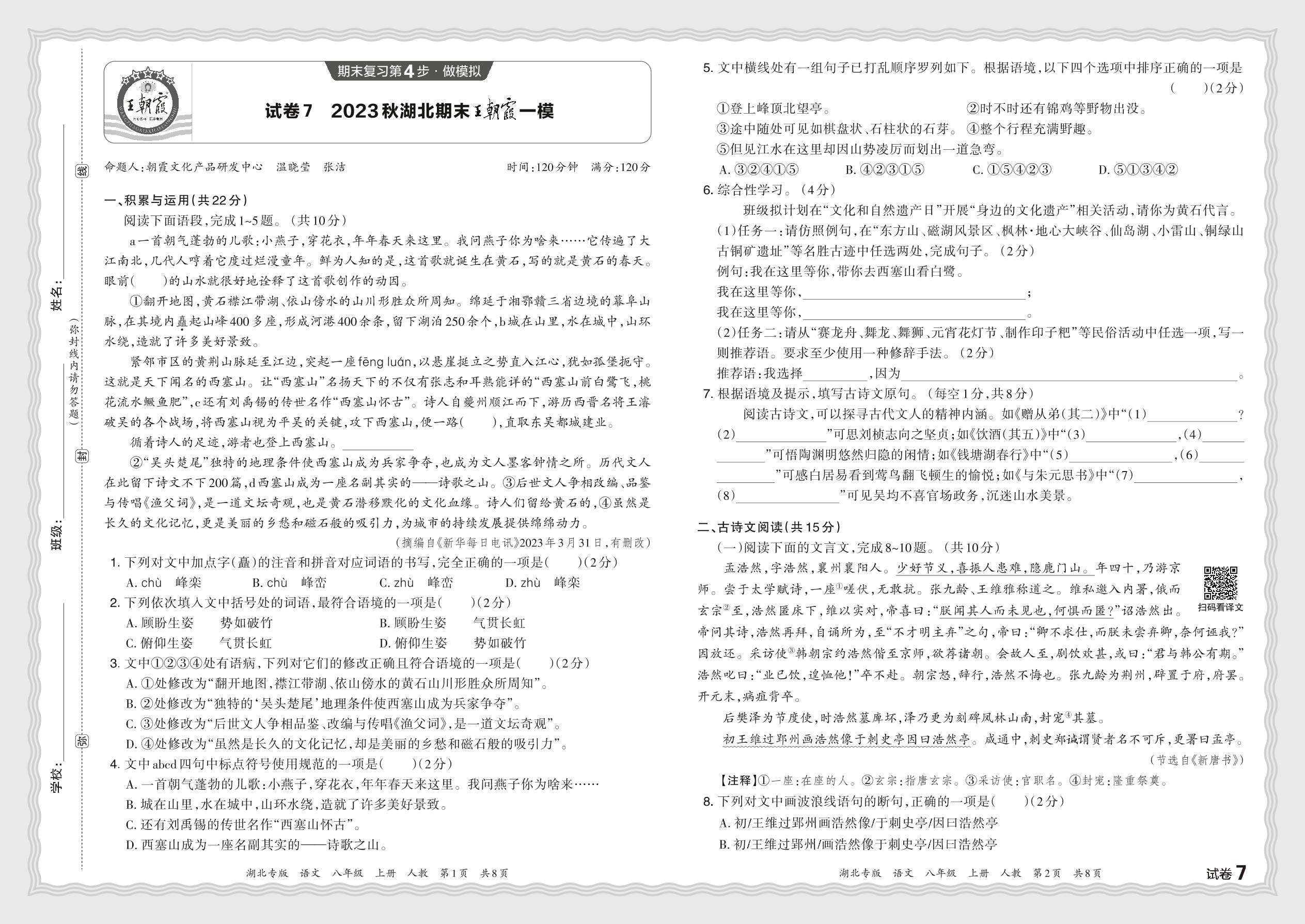 2023秋上册八年级语文人教版 湖北期末王朝霞一模