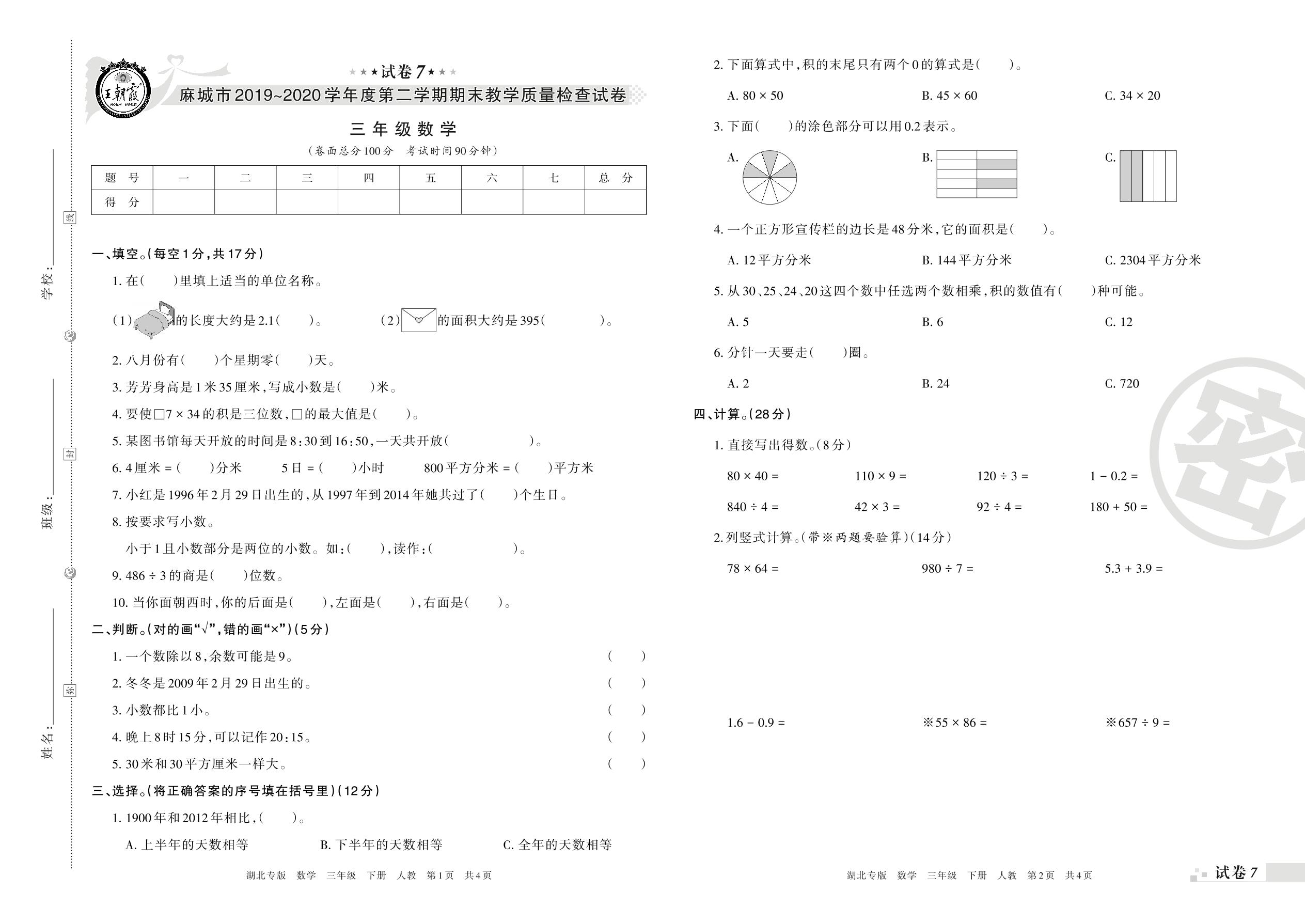 2019-2020学年第二学期麻城市三年级数学试卷(人教版)【7】