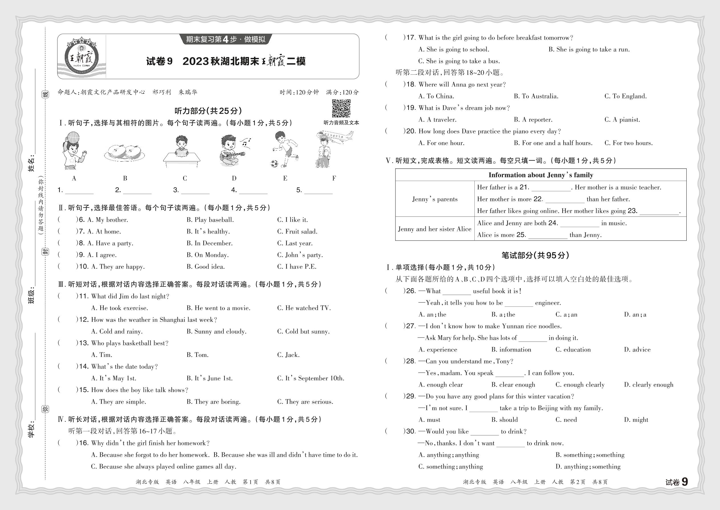 2023秋上册八年级英语人教版 湖北期末王朝霞二模