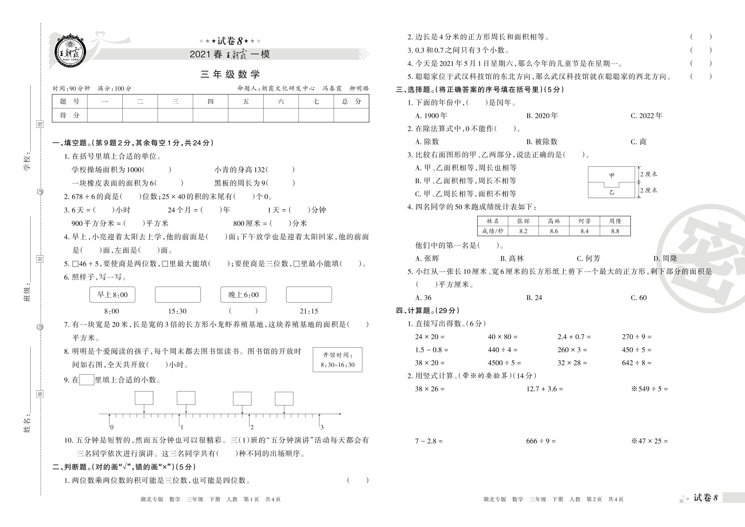 王朝霞期末模拟卷三年级下册数学(人教版)_R21080490210【8】