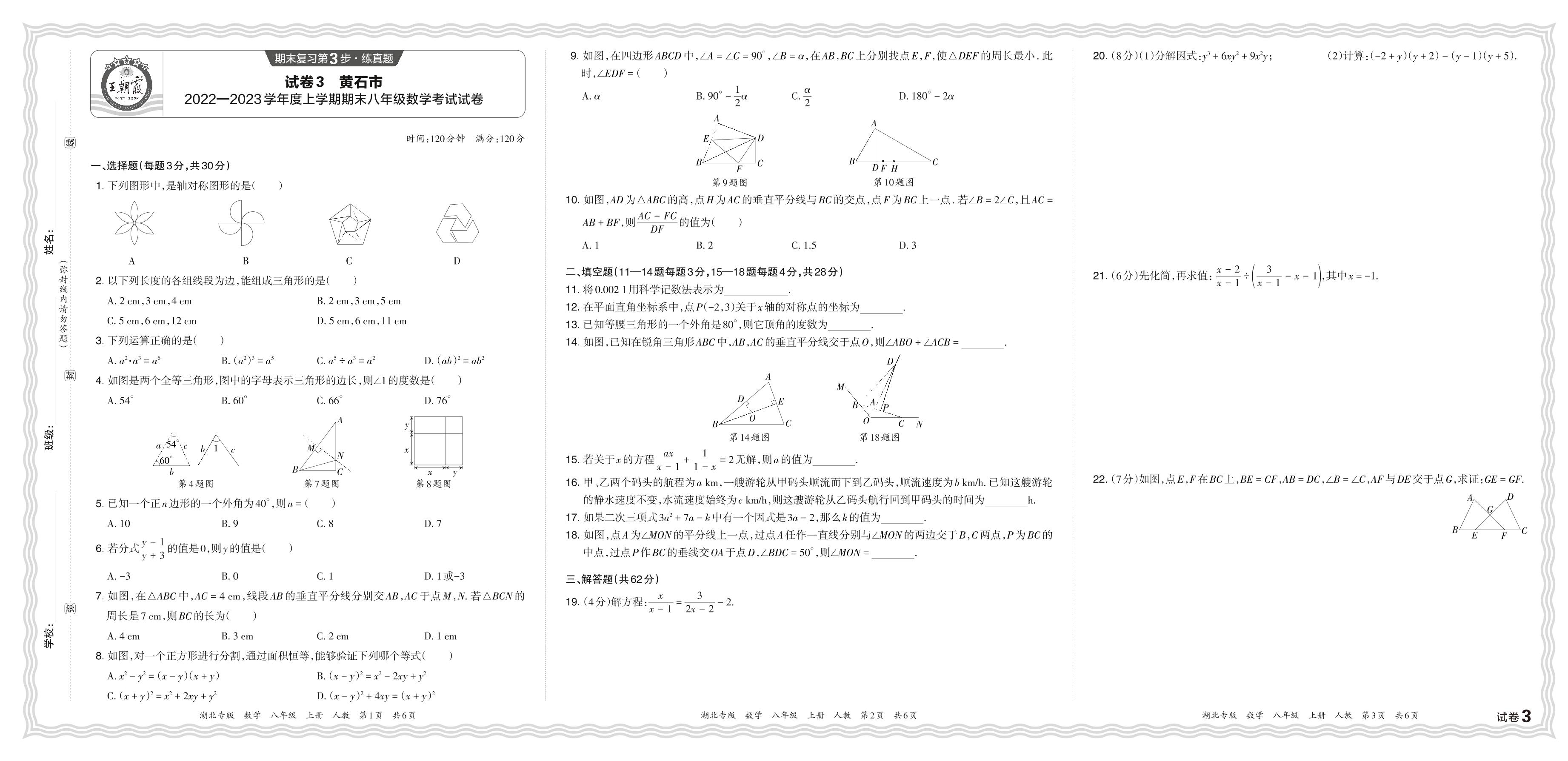 湖北省黄石市2022—2023学年度上学期期末八年级数学考试试卷(人教版)【3】