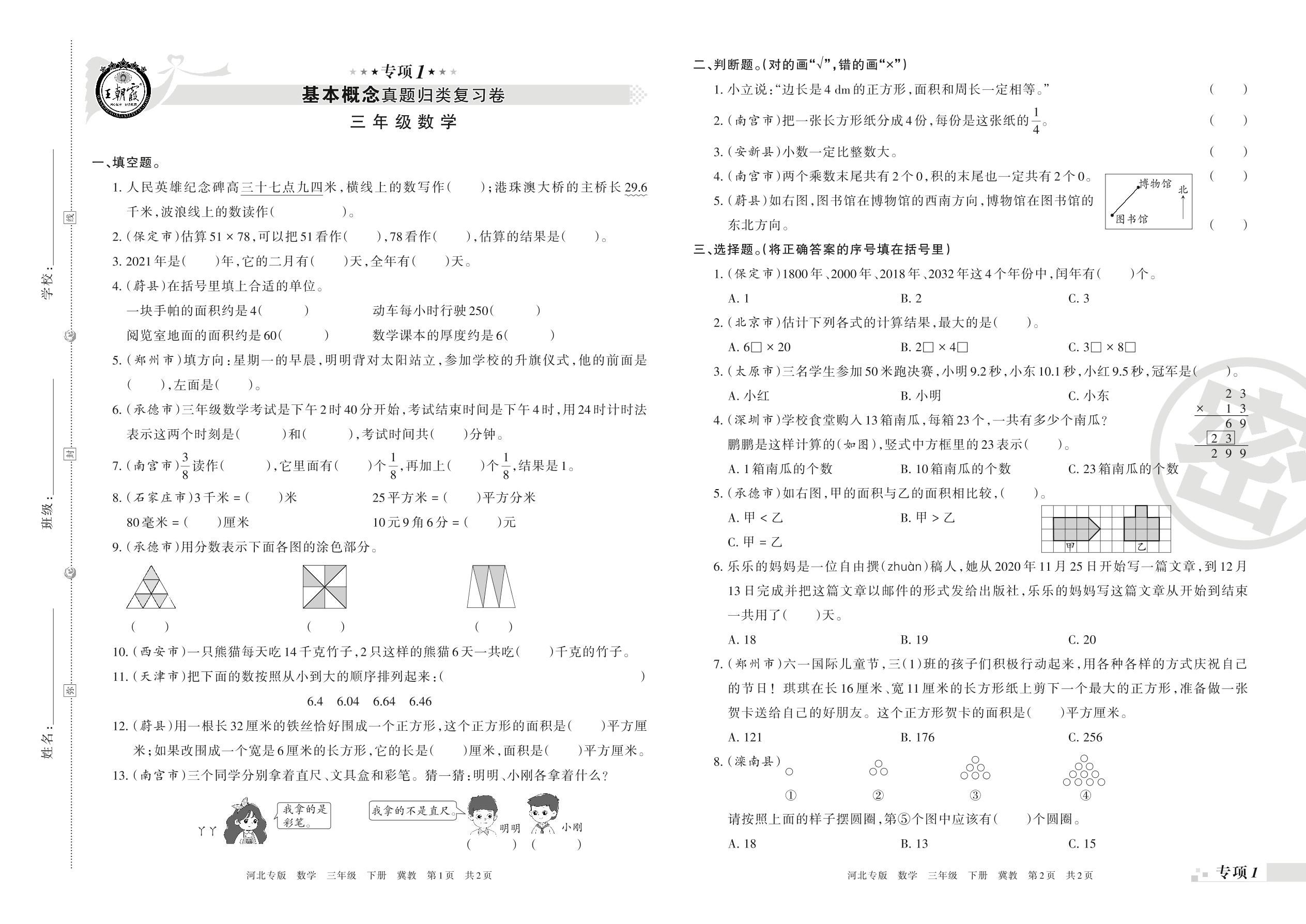 王朝霞期末专项卷——基本概念、计算真题归类复习三年级下册数学(冀教版)【0】