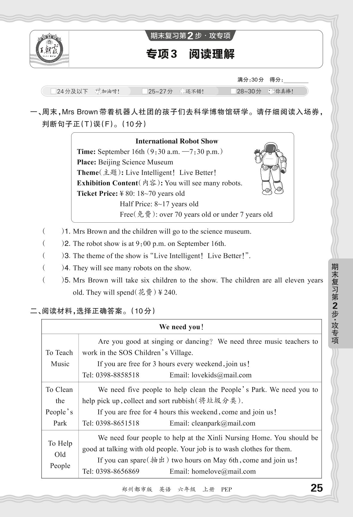2023秋上册六年级英语人教PEP版 期末专项卷·阅读理解【3】