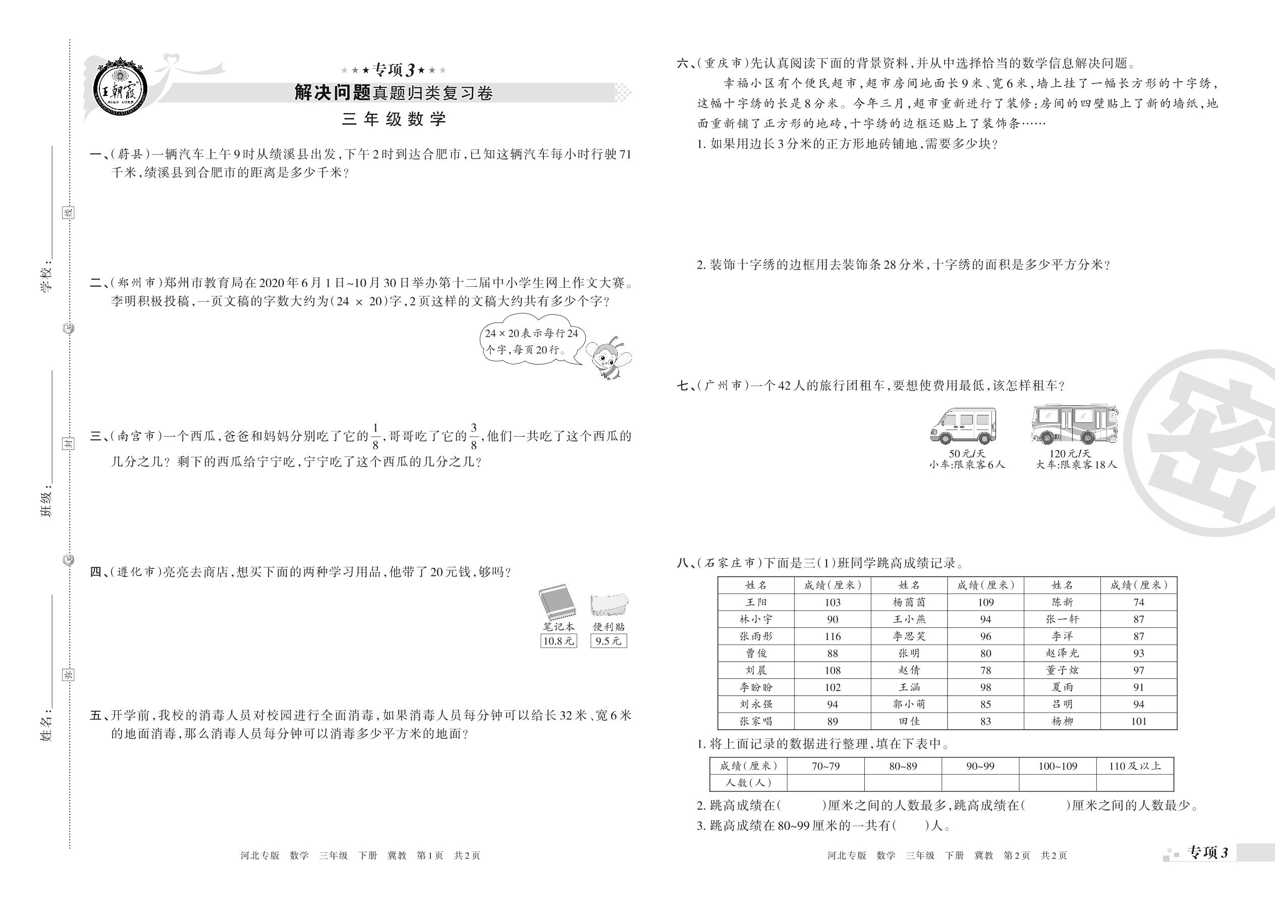 王朝霞期末专项卷——解决问题真题归类复习、新颖题速递:生活与数学三年级下册数学(冀教版)【0】