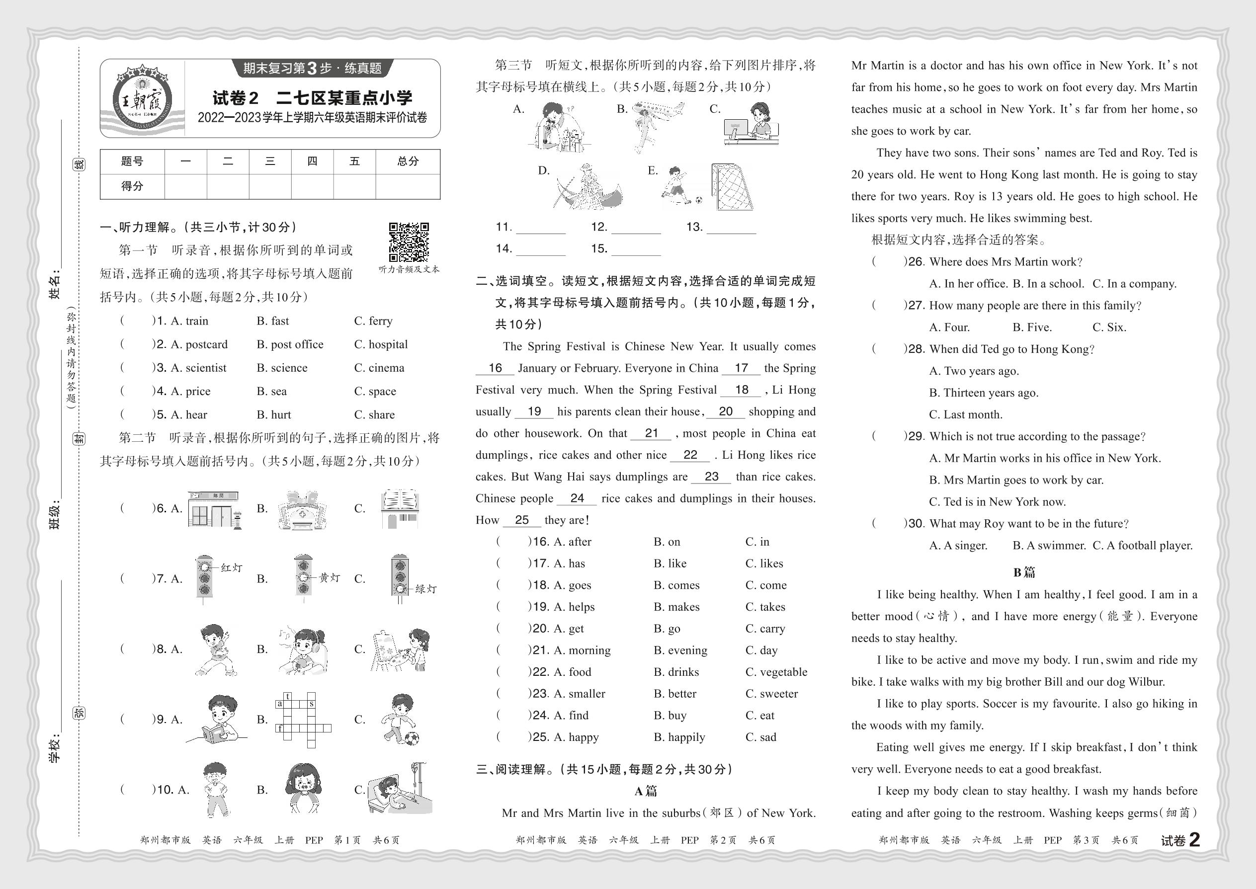 河南省郑州市二七区某重点小学2022—2023学年上学期六年级英语期末评价试卷(人教PEP版)【2】