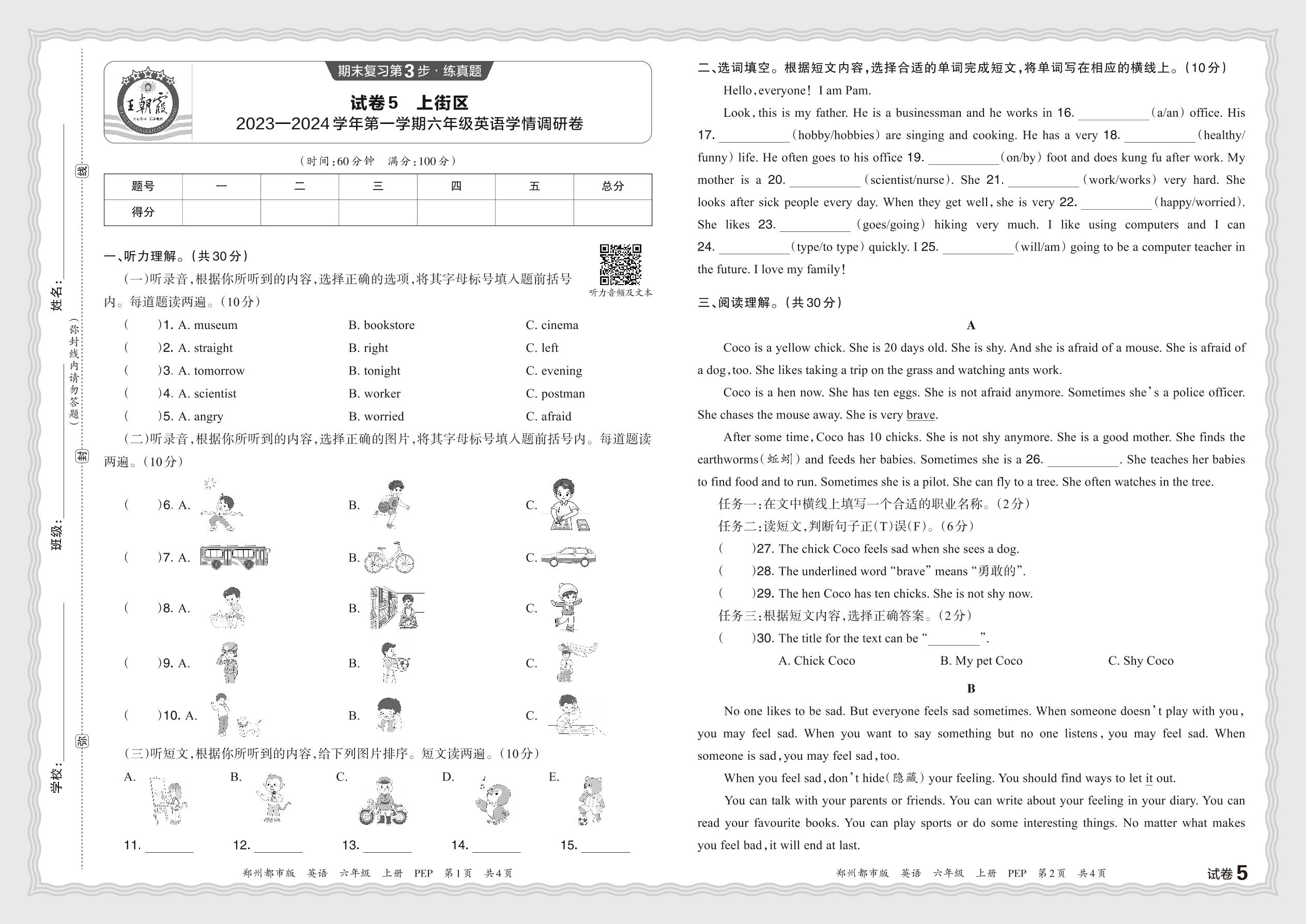 河南省郑州市上街区2023—2024学年第一学期六年级英语学情调研卷(人教PEP版)【5】