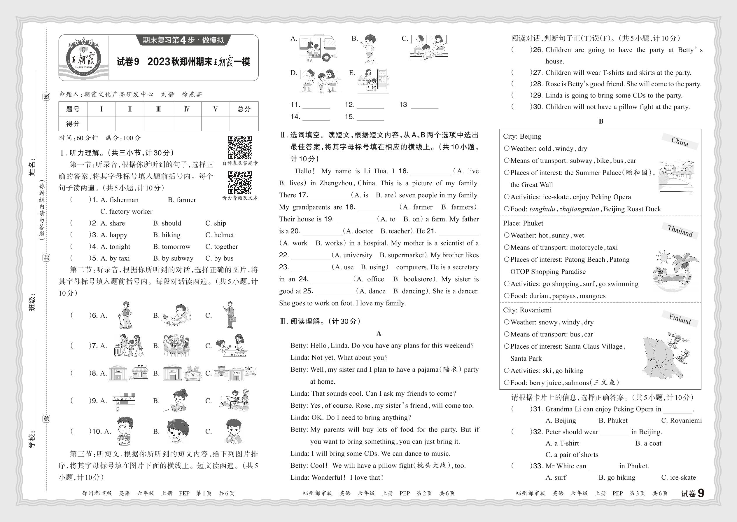 2023秋上册六年级英语人教PEP版 河南郑州期末王朝霞一模【9】