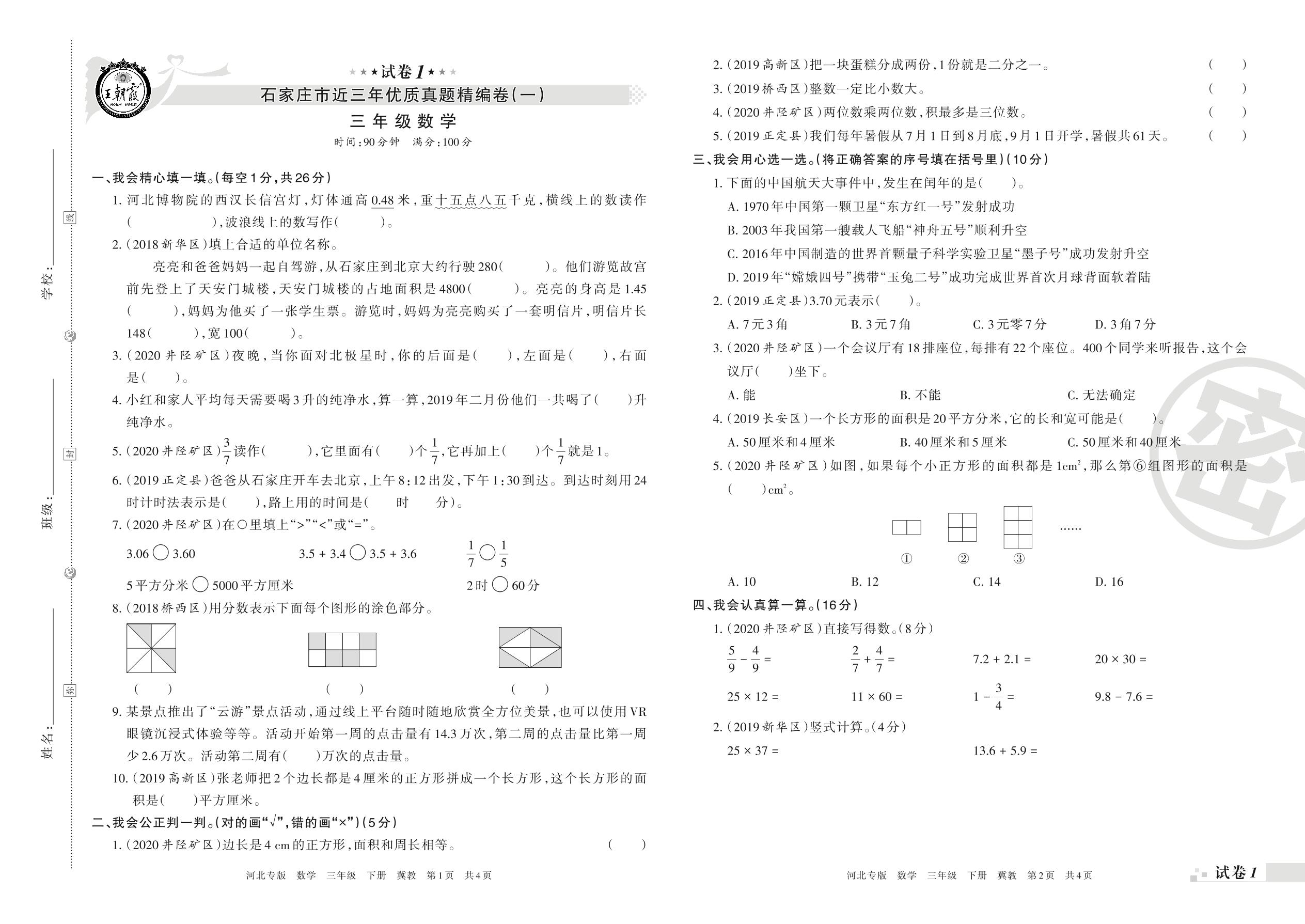石家庄市近三年优质真题精编卷(一)三年级下册数学(冀教版)【1】