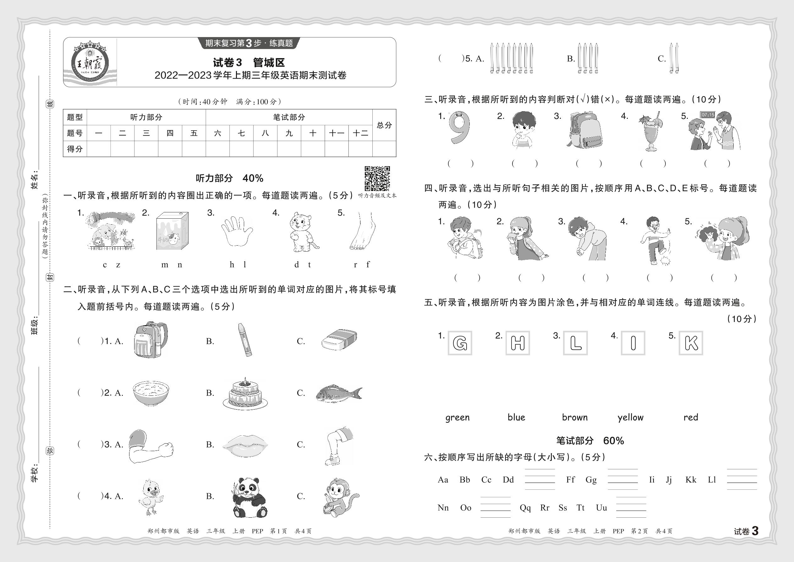 河南省郑州市管城区2022—2023学年上期三年级英语期末测试卷(人教PEP版)【3】