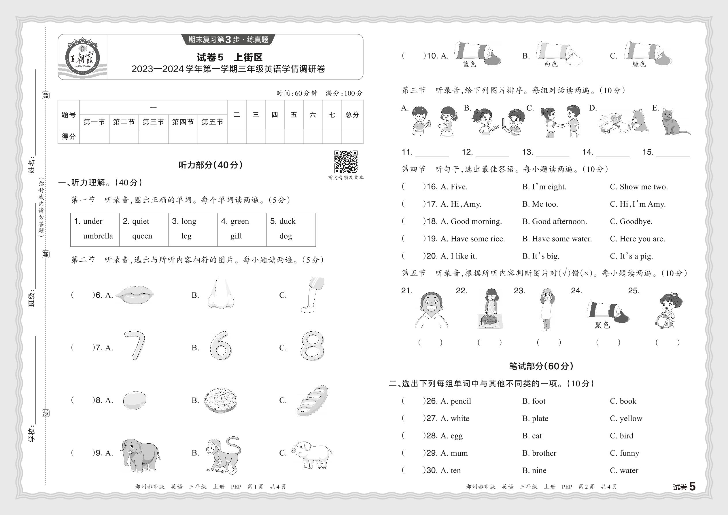 河南省郑州市上街区2023—2024学年第一学期三年级英语学情调研卷(人教PEP版)【5】