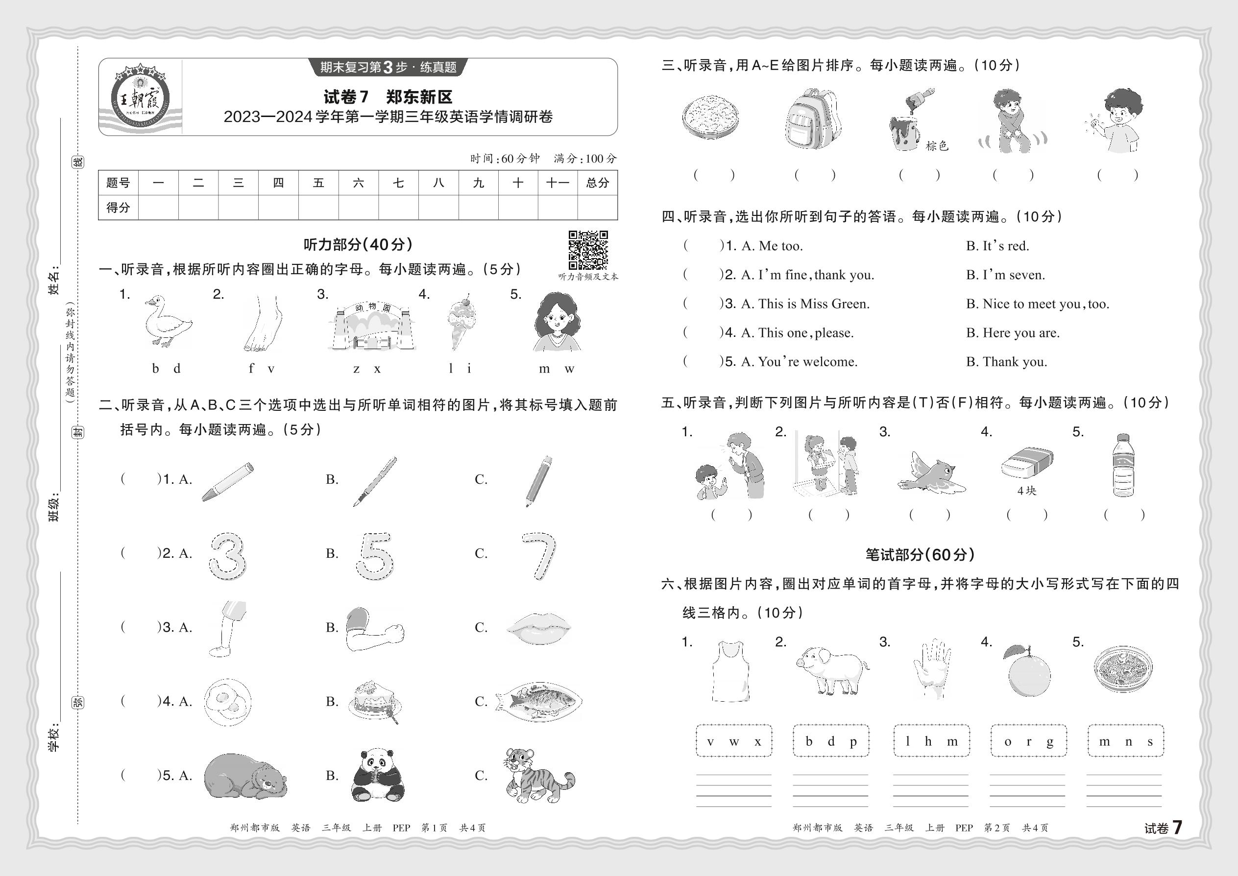 河南省郑州市郑东新区2023—2024 学年第一学期三年级英语学情调研卷(人教PEP版)【7】