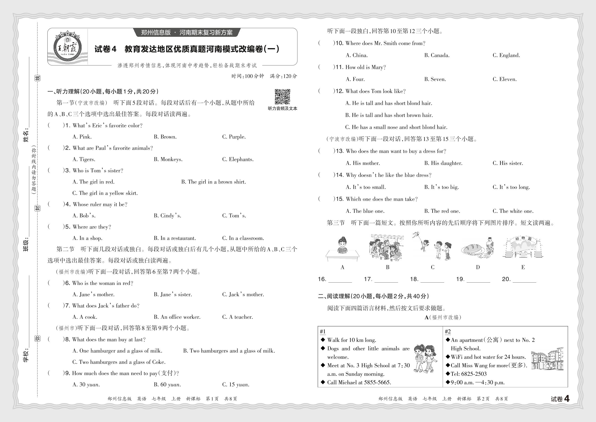 2023年秋教育发达地区优质真题河南模式改编卷(一)七年级上册期末英语(新课标版)【4】