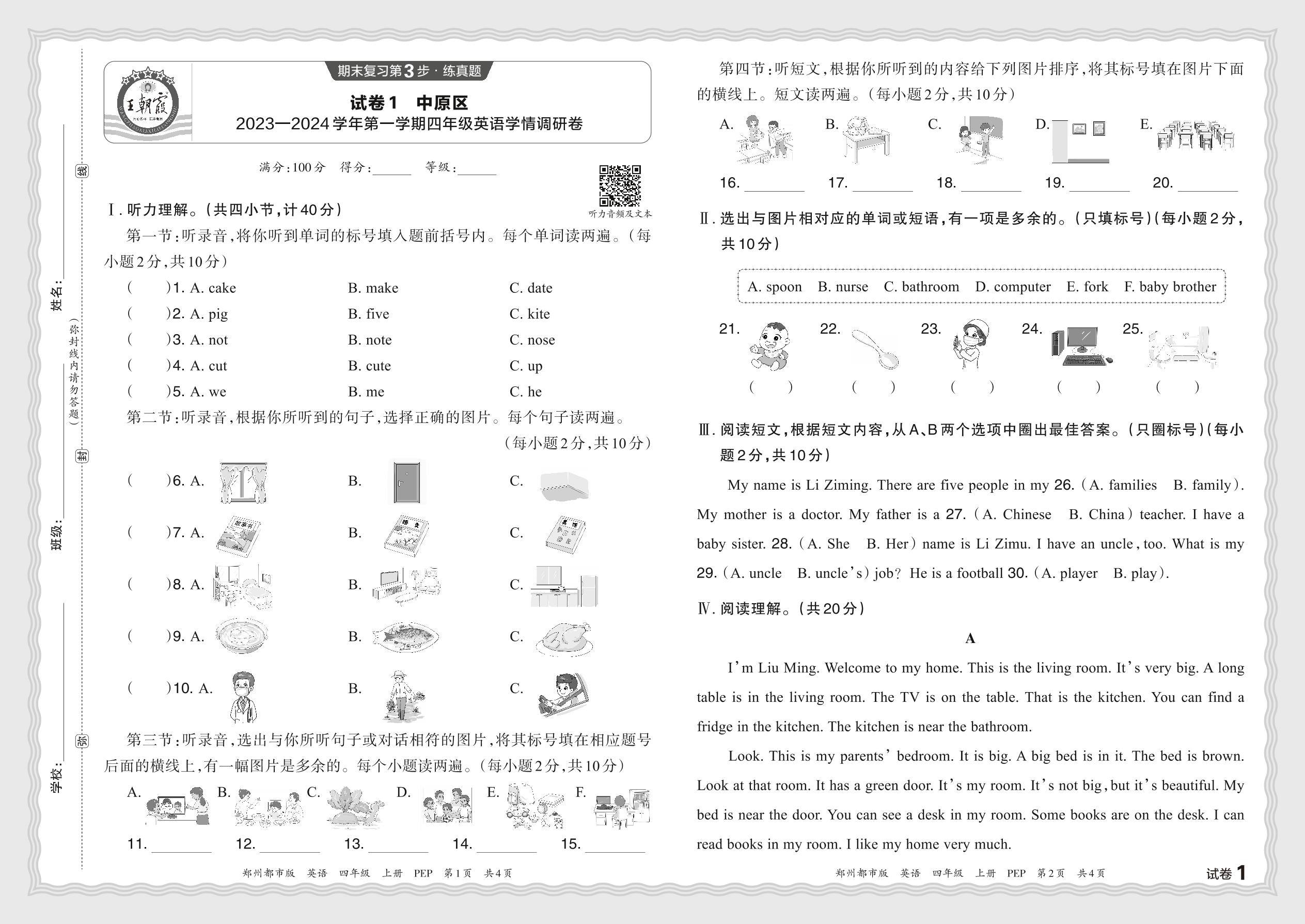河南省郑州市中原区2023—2024学年第一学期四年级英语学情调研卷(人教PEP版)【1】