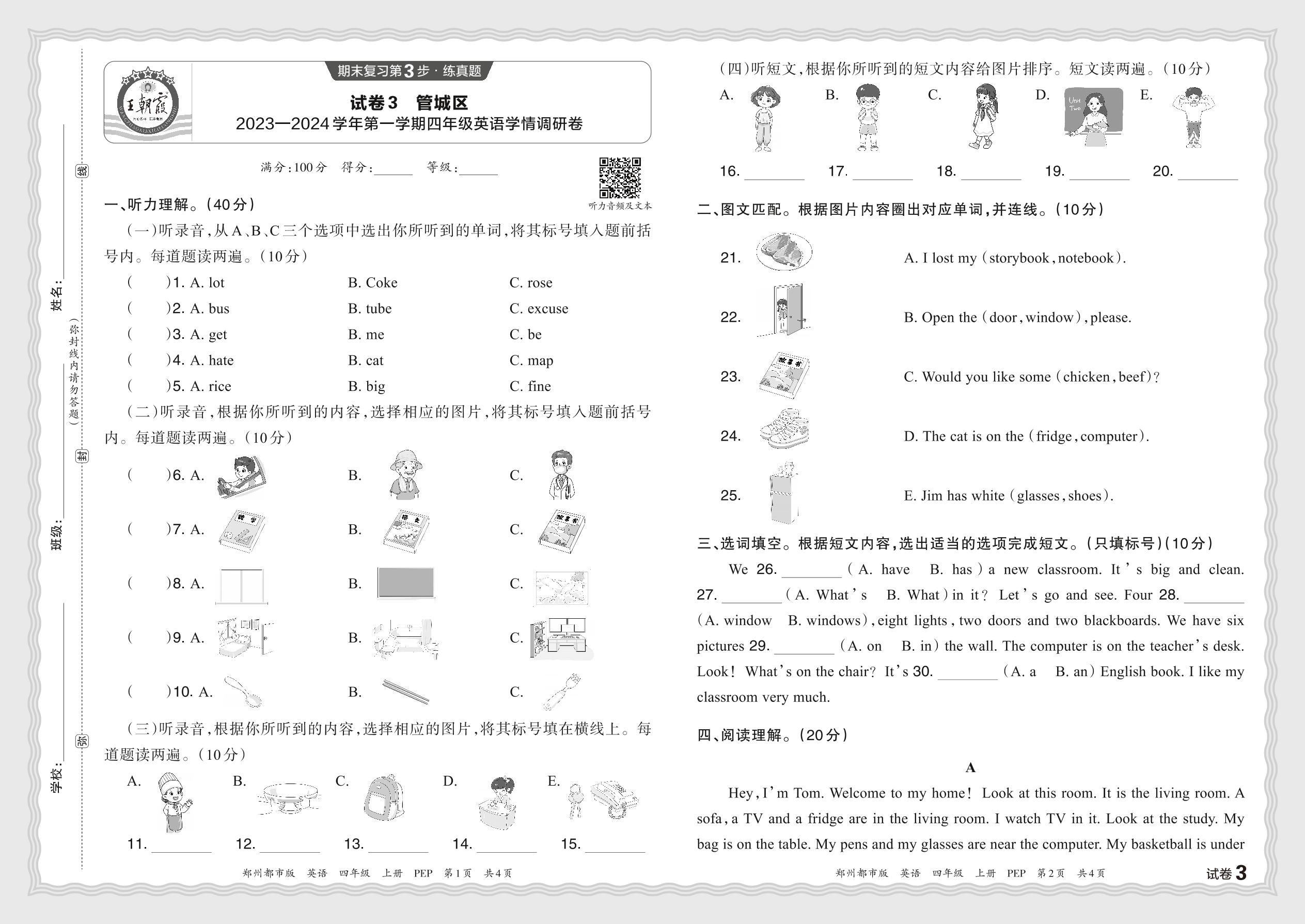 河南省郑州市管城区2023—2024学年第一学期四年级英语学情调研卷(人教PEP版)【3】