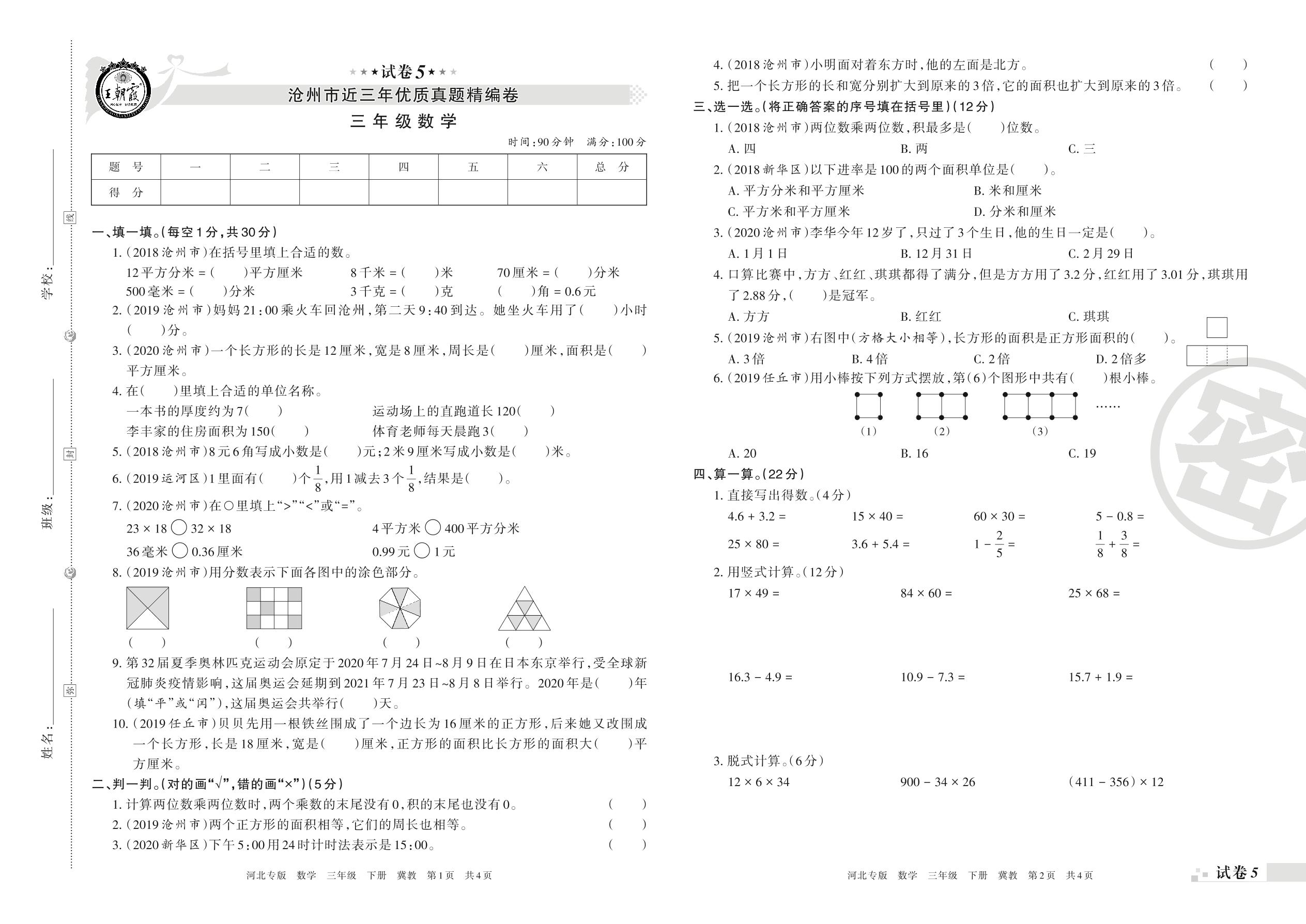 沧州市近三年优质真题精编卷三年级下册数学(冀教版)【5】