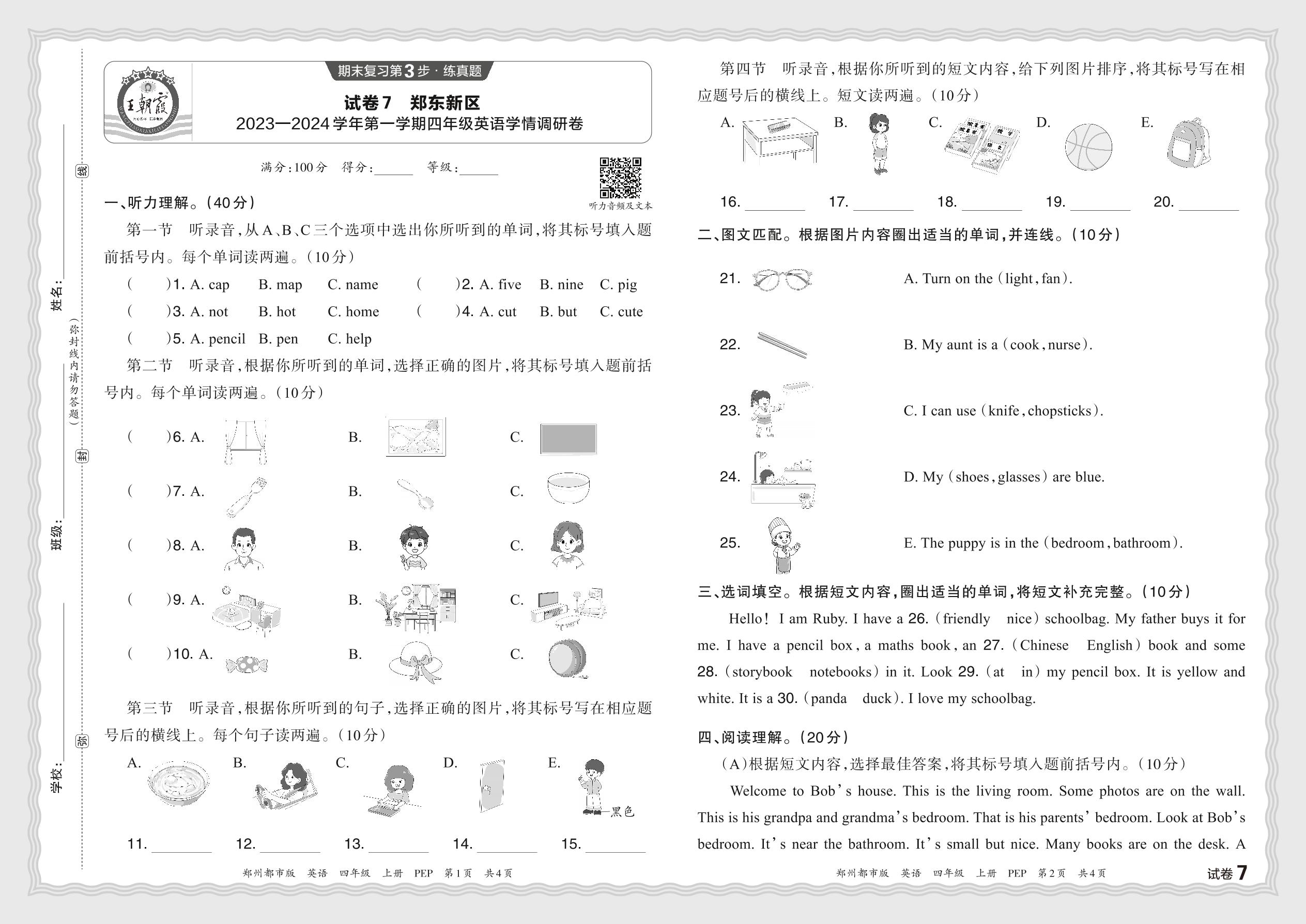 河南省郑州市郑东新区2023—2024 学年第一学期四年级英语学情调研卷(人教PEP版)【7】