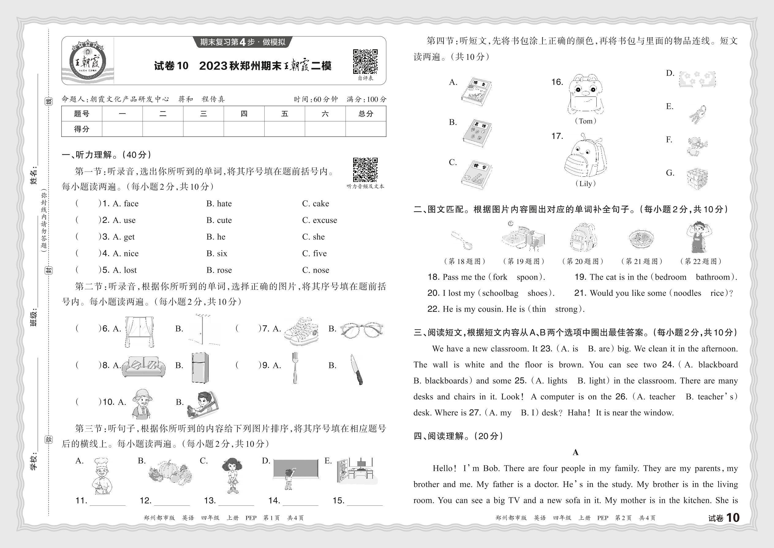 2023秋上册四年级英语人教PEP版 河南郑州期末王朝霞二模【10】