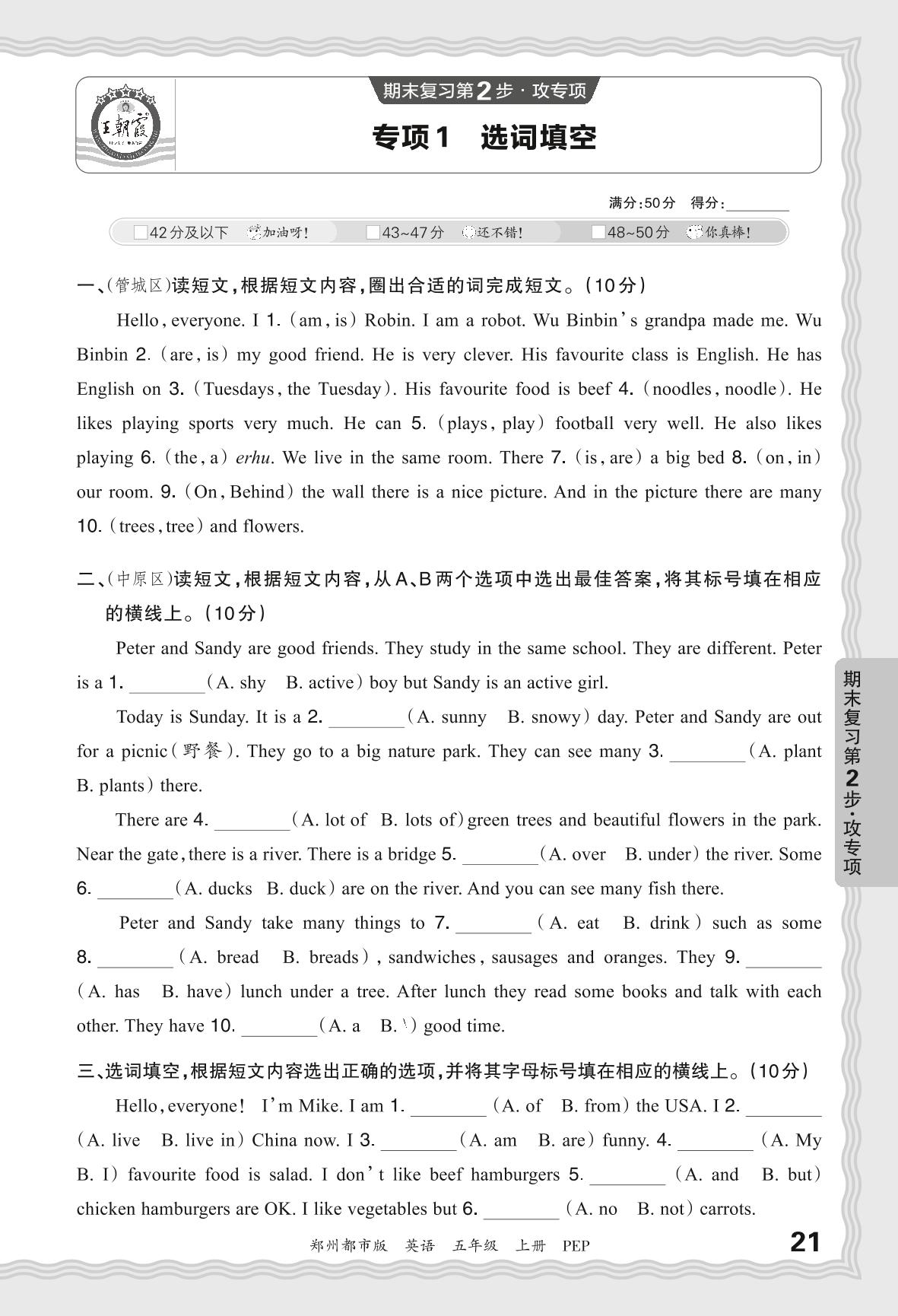 2023秋上册五年级英语人教PEP版 期末专项卷·选词填空【1】