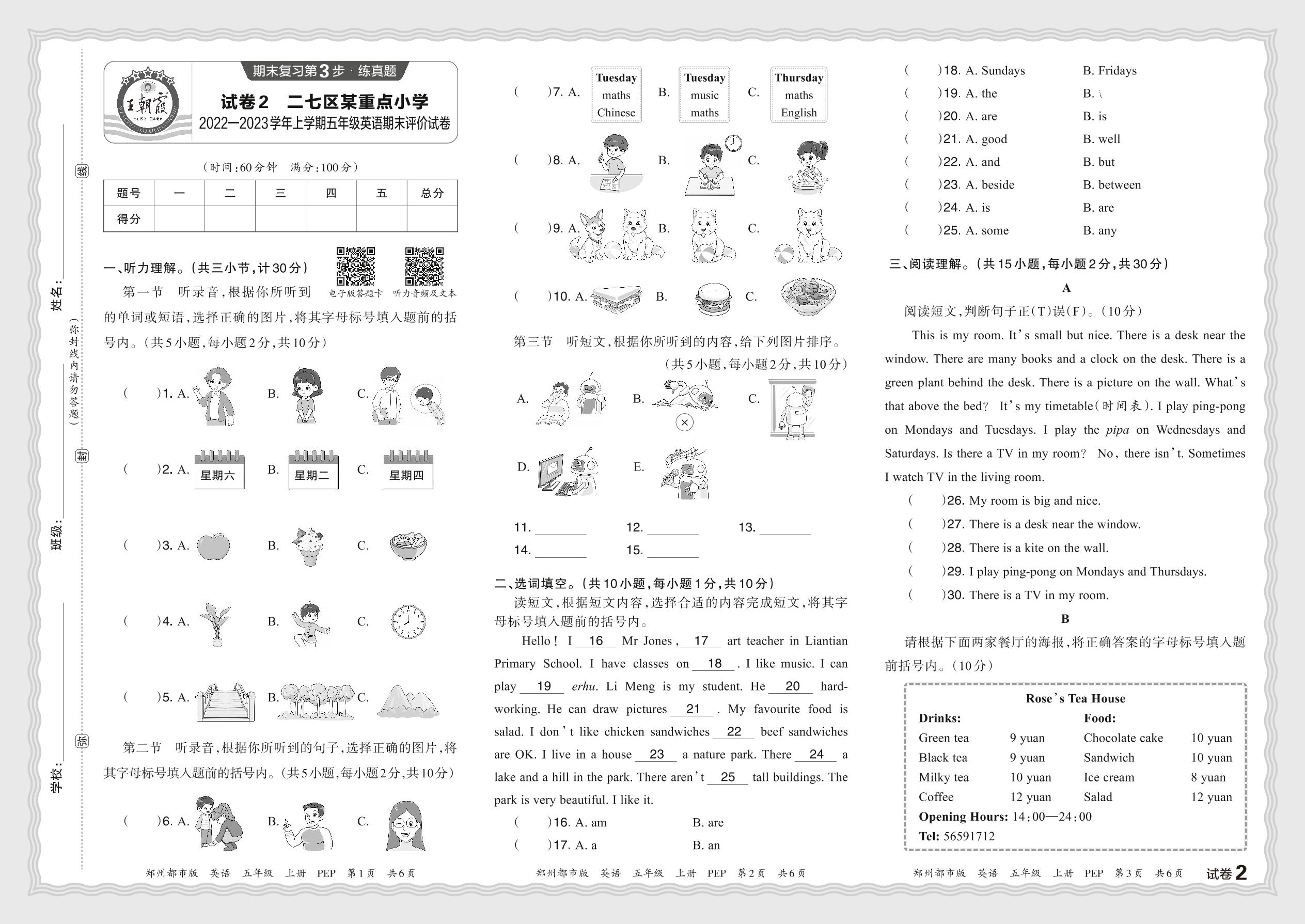 河南省郑州市二七区某重点小学2022—2023学年上学期五年级英语期末评价试卷(人教PEP版)【2】