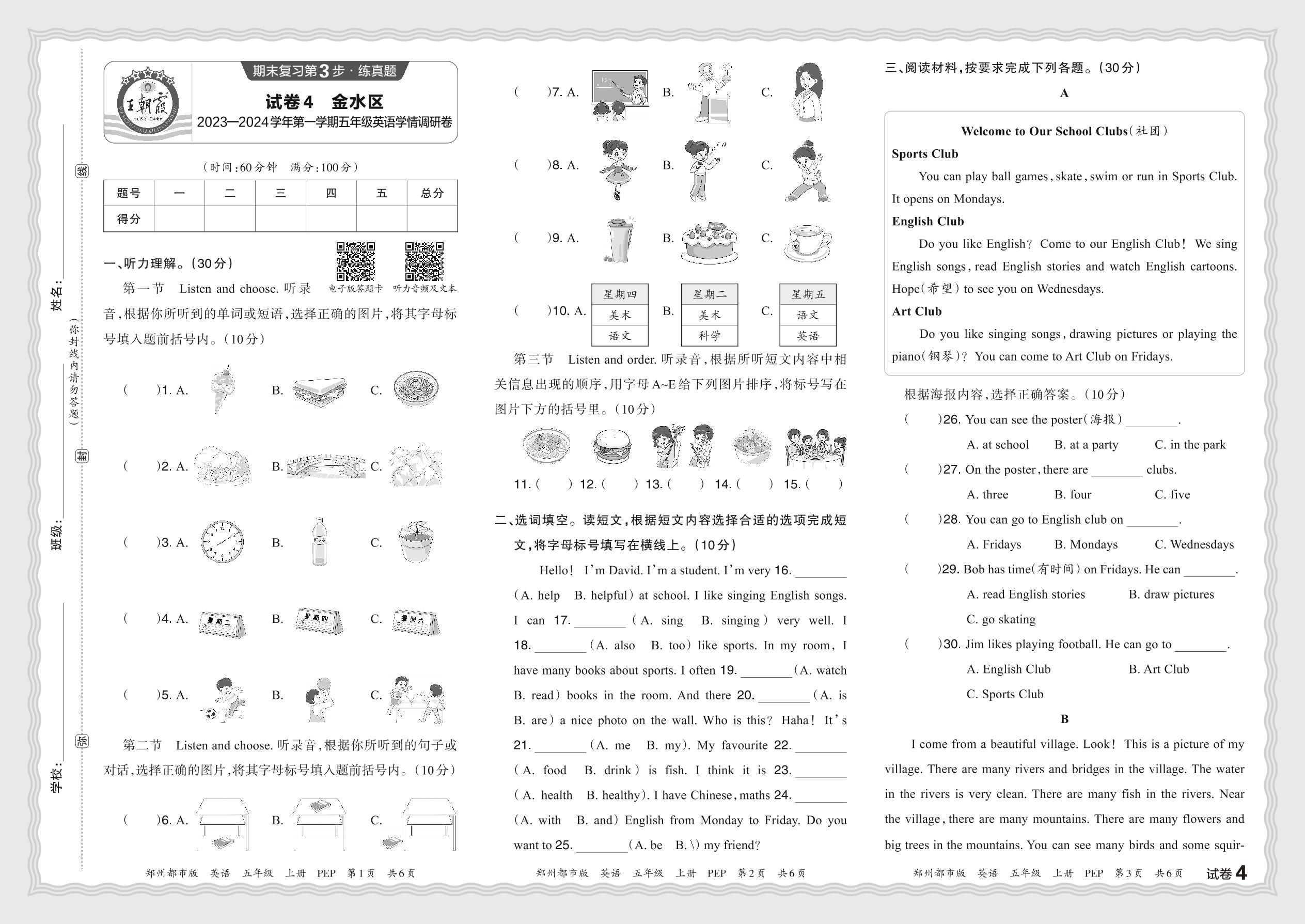 河南省郑州市金水区2023—2024学年第一学期五年级英语学情调研卷(人教PEP版)【4】