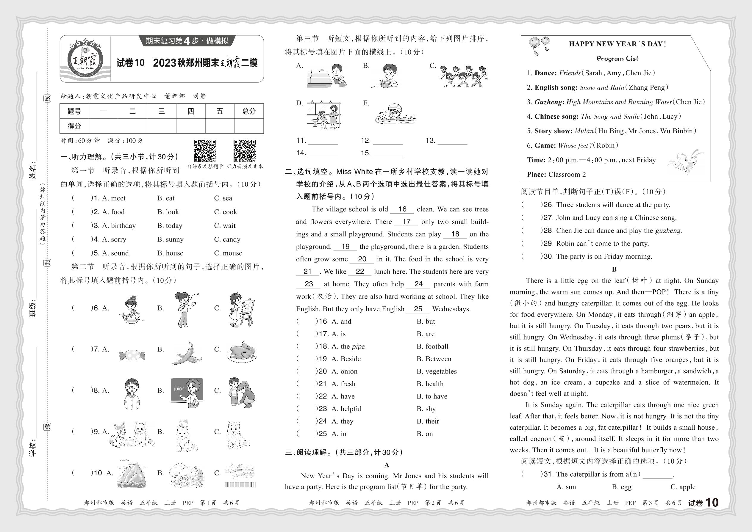 2023秋上册五年级英语人教PEP版 河南郑州期末王朝霞二模【10】