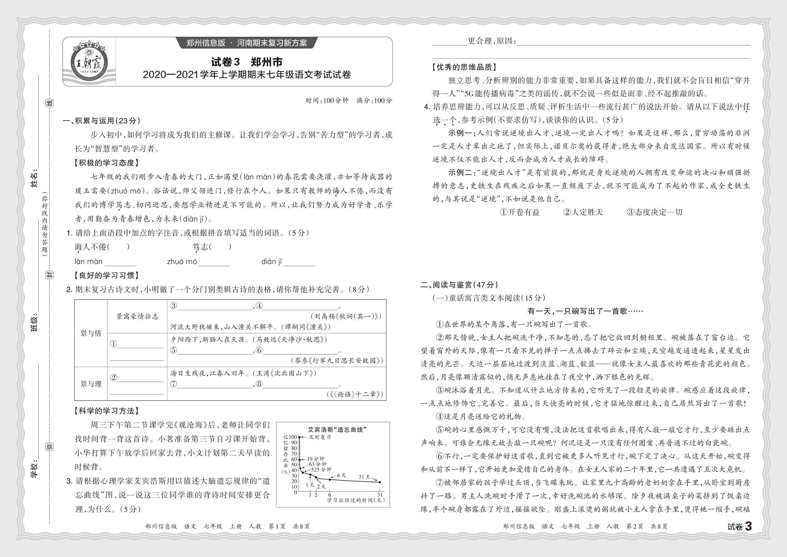 河南省郑州市2020—2021学年上学期期末七年级语文考试试卷(人教版)【3】