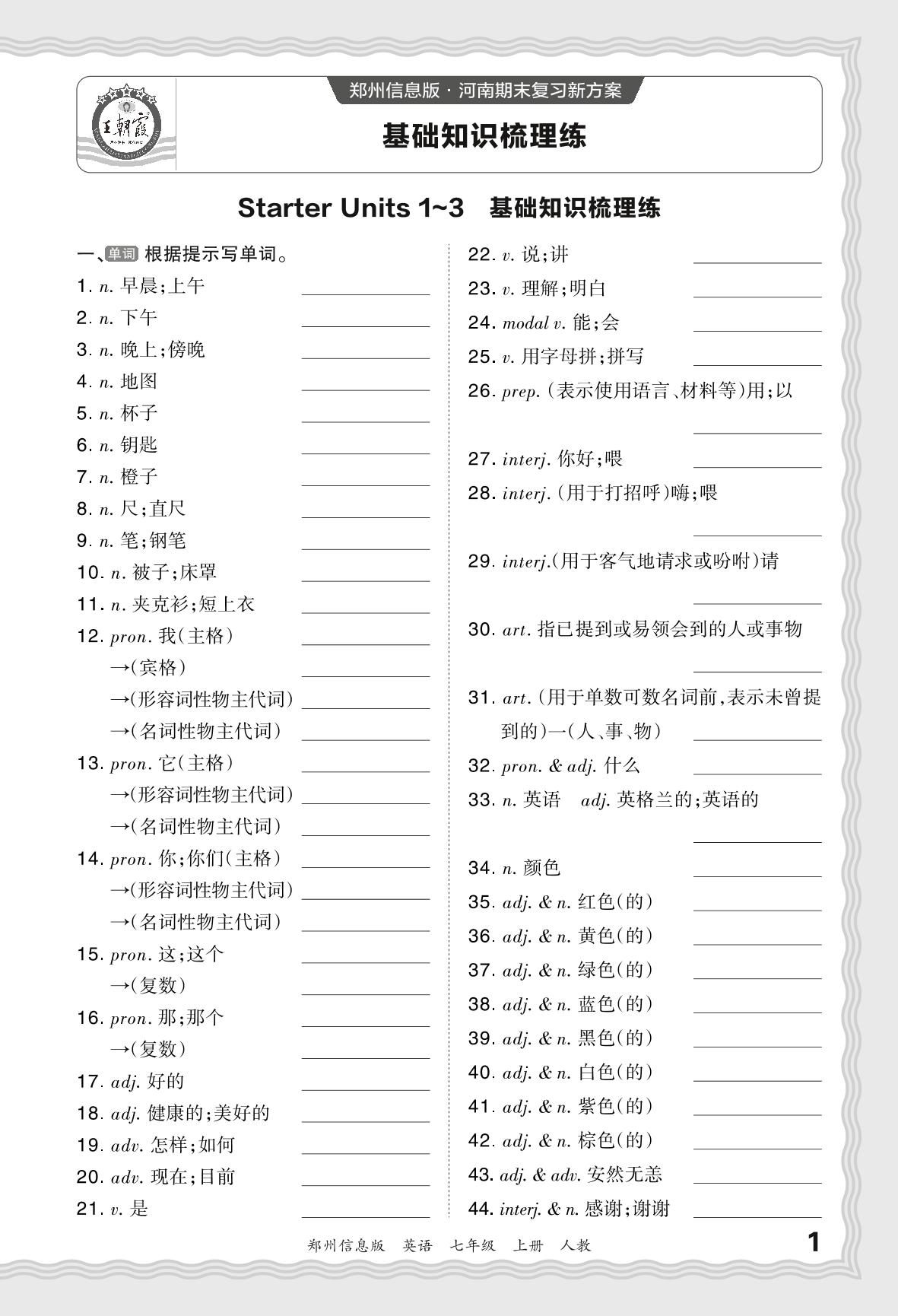 2023秋上册七年级英语人教版 期末过课本·Starter Units 1~3 基础知识梳理练_R231128095240939