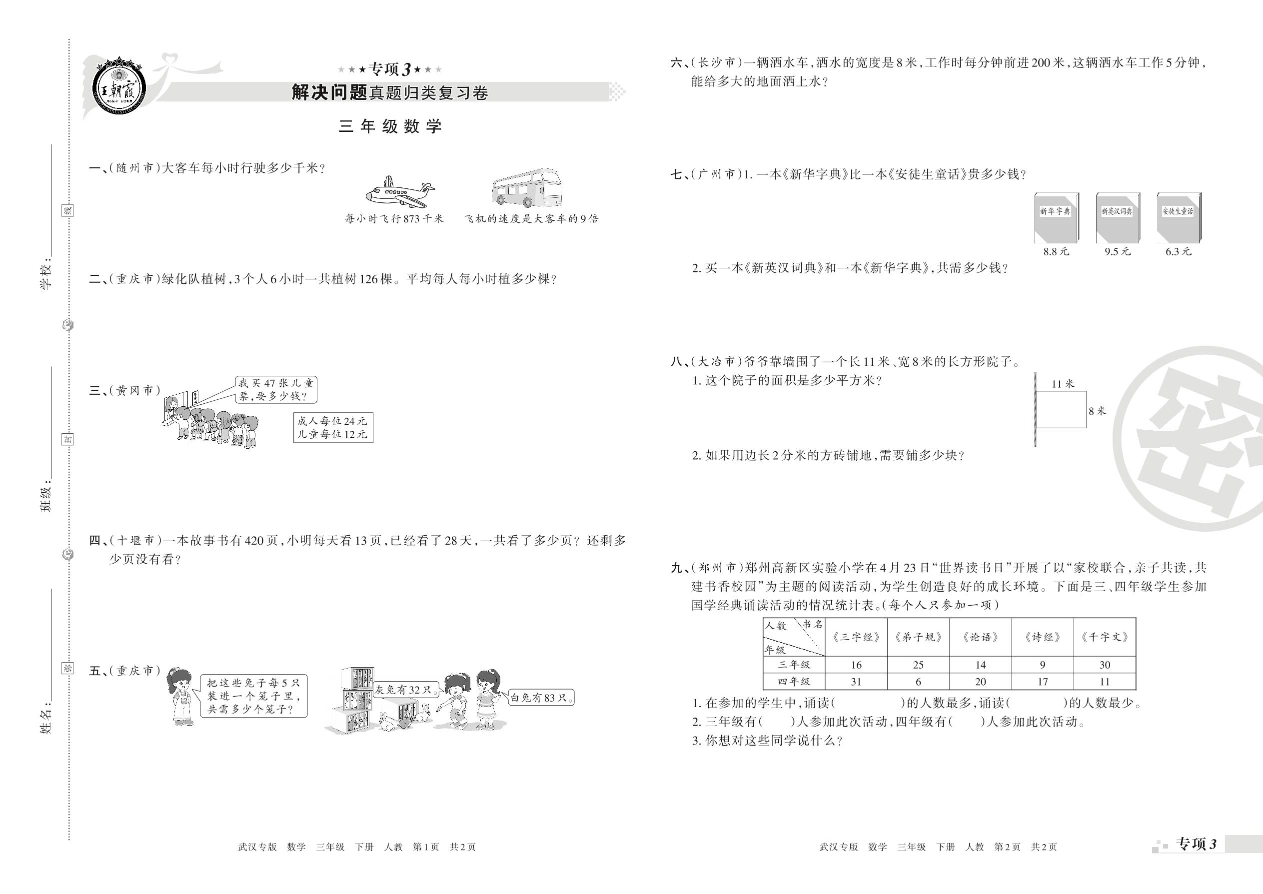 王朝霞期末专项卷——解决问题真题归类复习、新颖题速递:生活与数学三年级下册数学(人教版)_R21080490332【0】