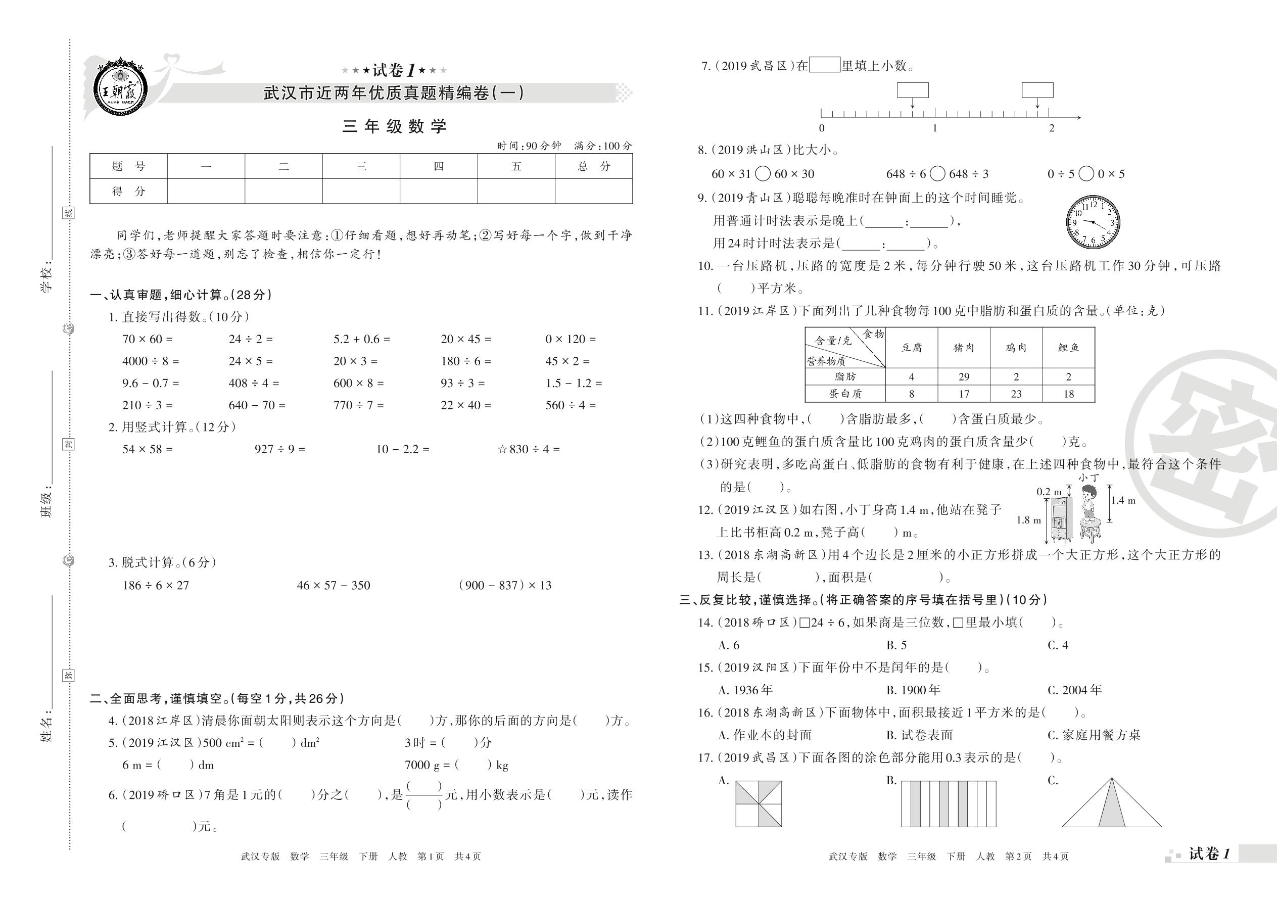 武汉市近两年优质真题精编卷(一)三年级下册数学(人教版)【1】