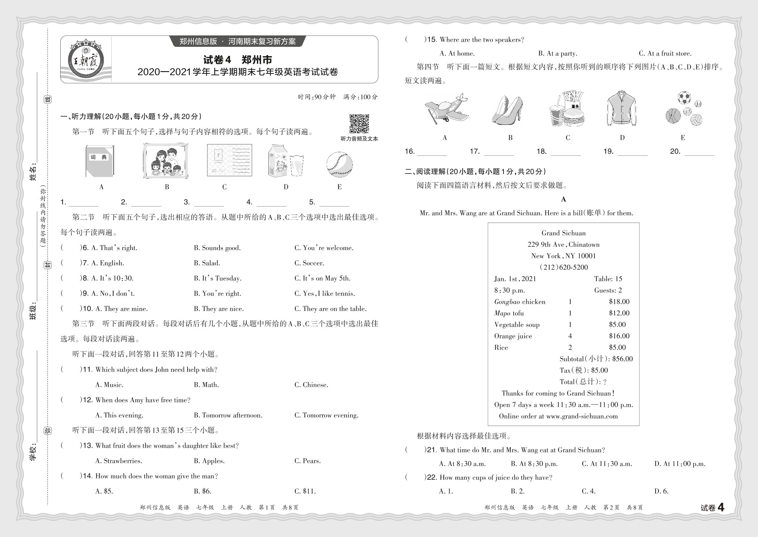 河南省郑州市2020—2021学年上学期期末七年级英语考试试卷(人教版)【4】