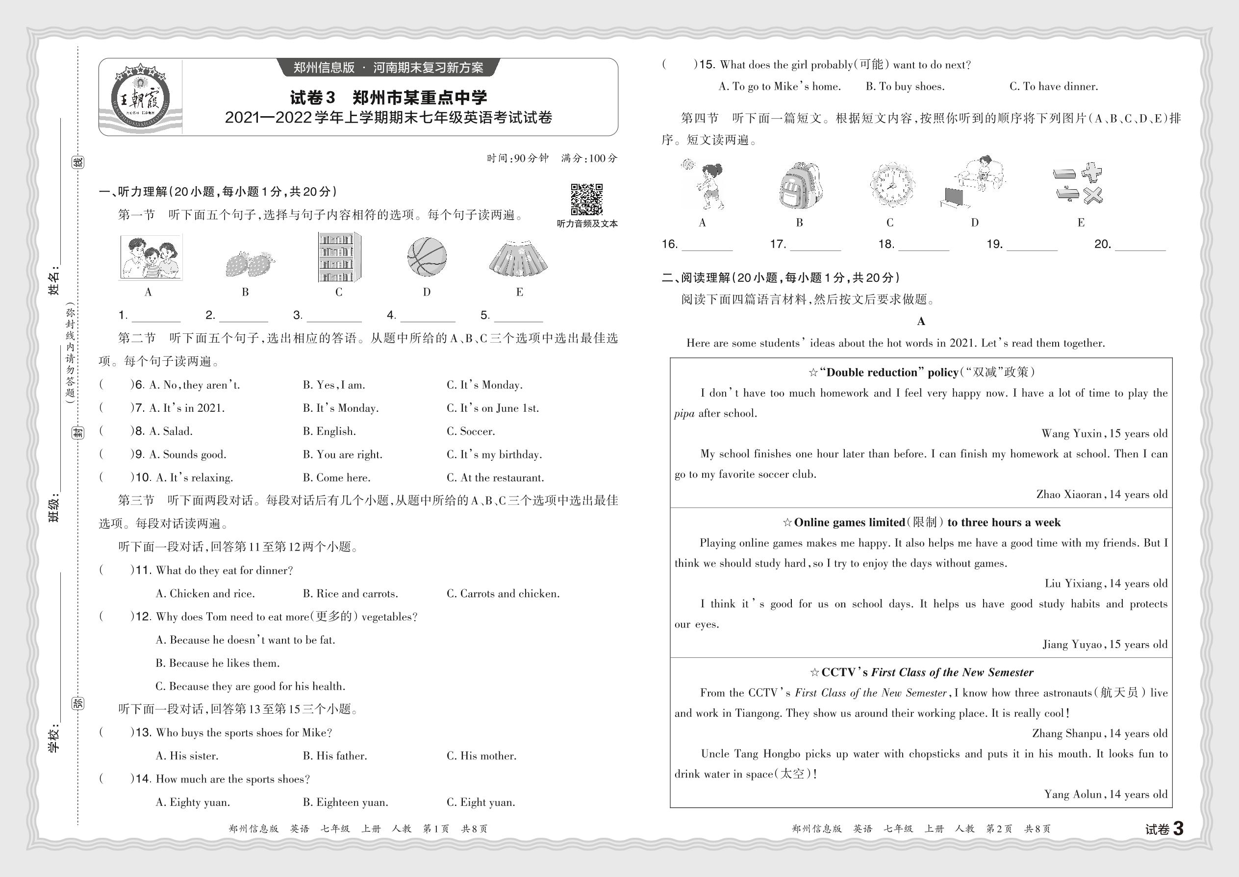 河南省郑州市某重点中学2021—2022学年上学期期末七年级英语考试试卷(人教版)【3】