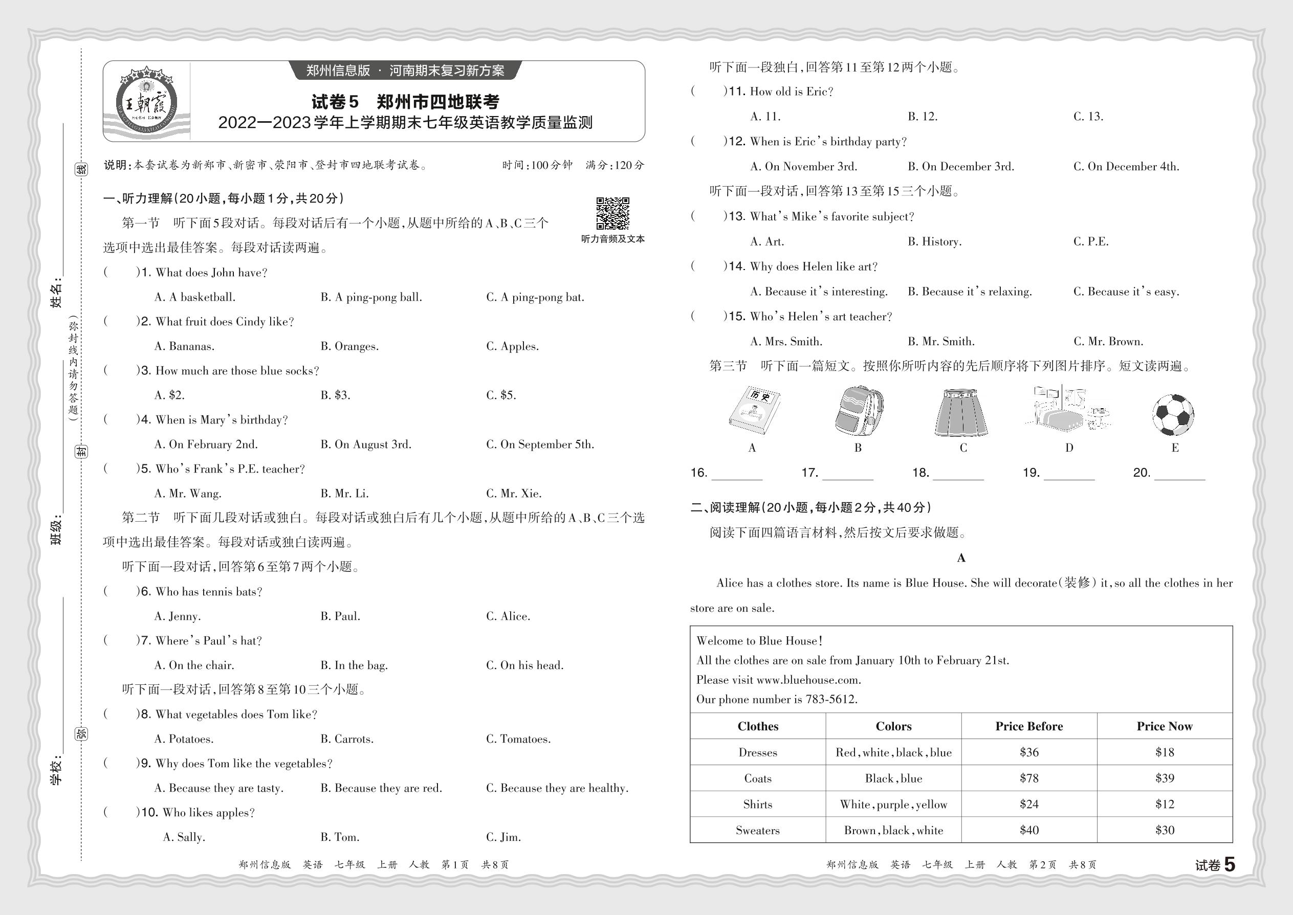 河南省郑州市四地联考2022—2023学年上学期期末七年级英语教学质量监测(人教版)【5】