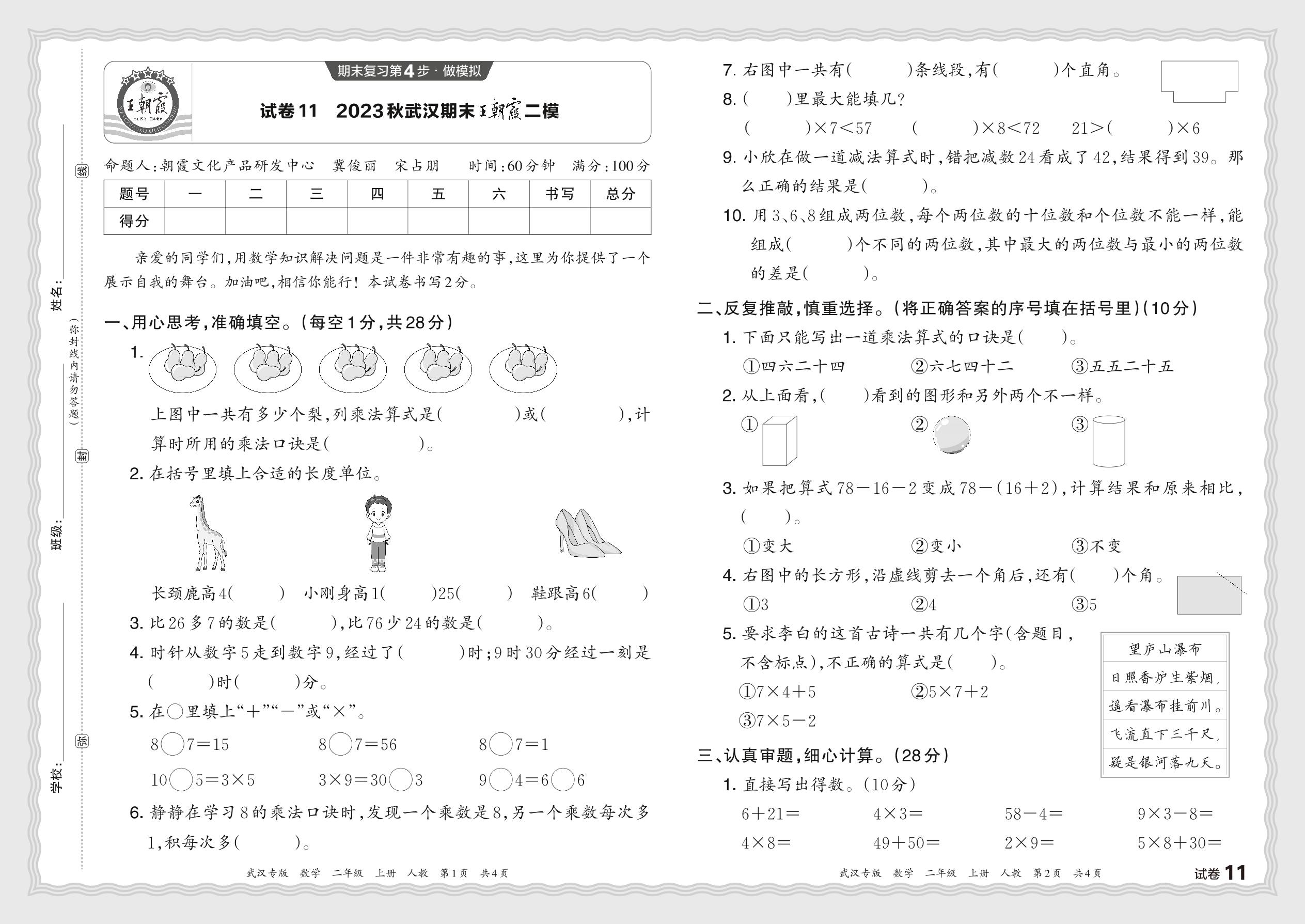 2023秋上册二年级数学人教版 湖北武汉期末王朝霞二模