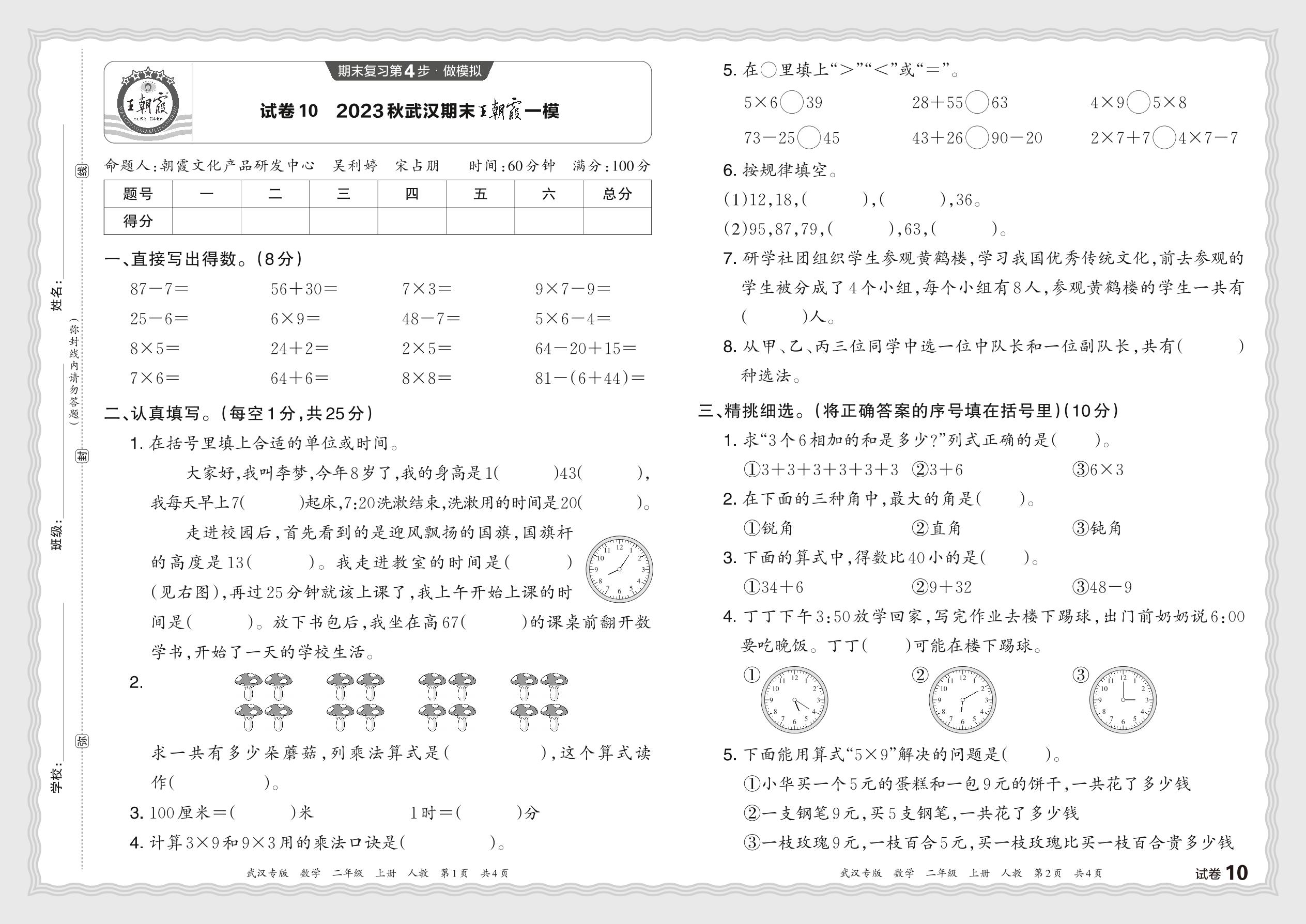 2023秋上册二年级数学人教版 湖北武汉期末王朝霞一模