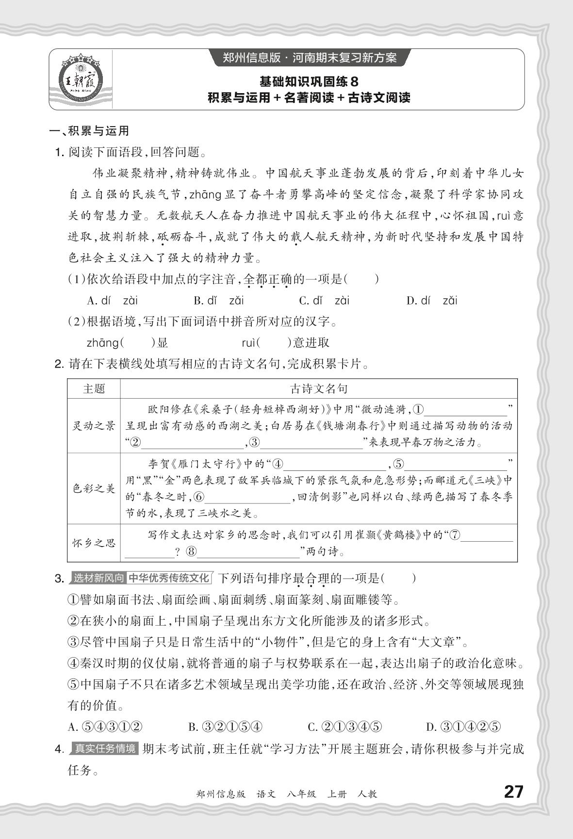 2023秋上册八年级语文人教版 期末过课本·基础知识巩固练 积累与运用+名著阅读+古诗文阅读【8】