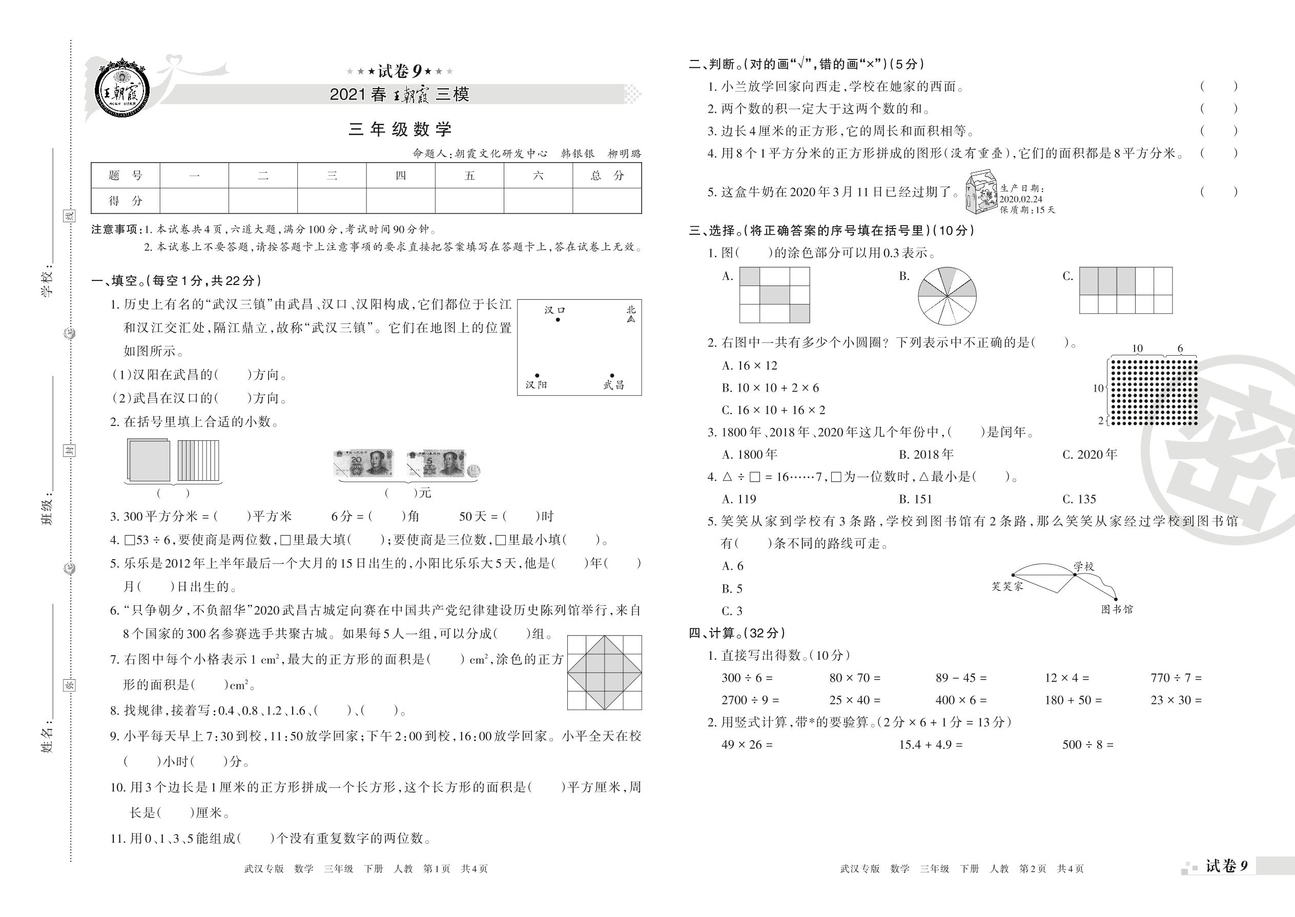 王朝霞期末模拟卷三年级下册数学(人教版)_R21080490359【9】