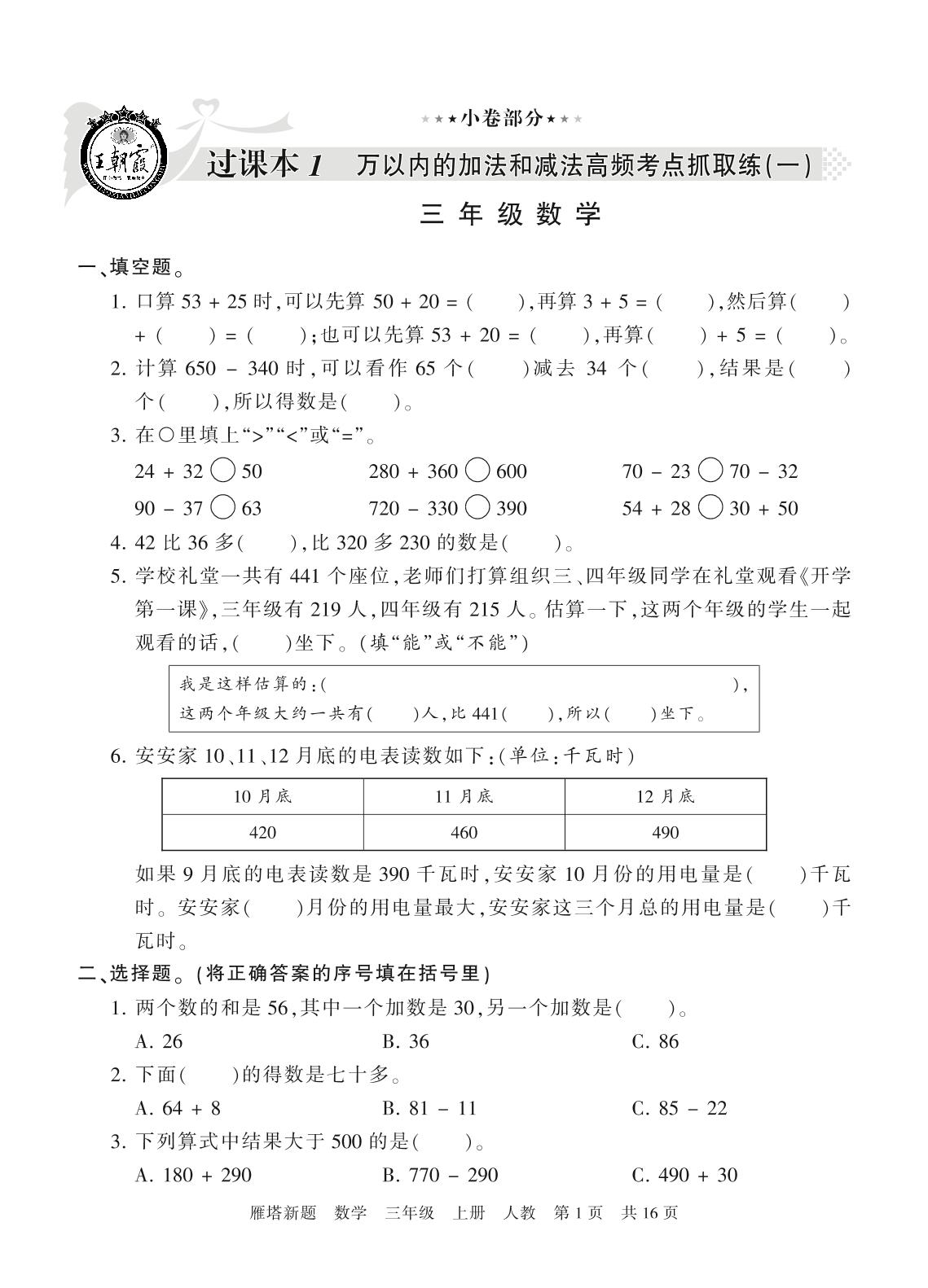 王朝霞期末过课本三年级上册数学(人教版)_R21080490415【0】