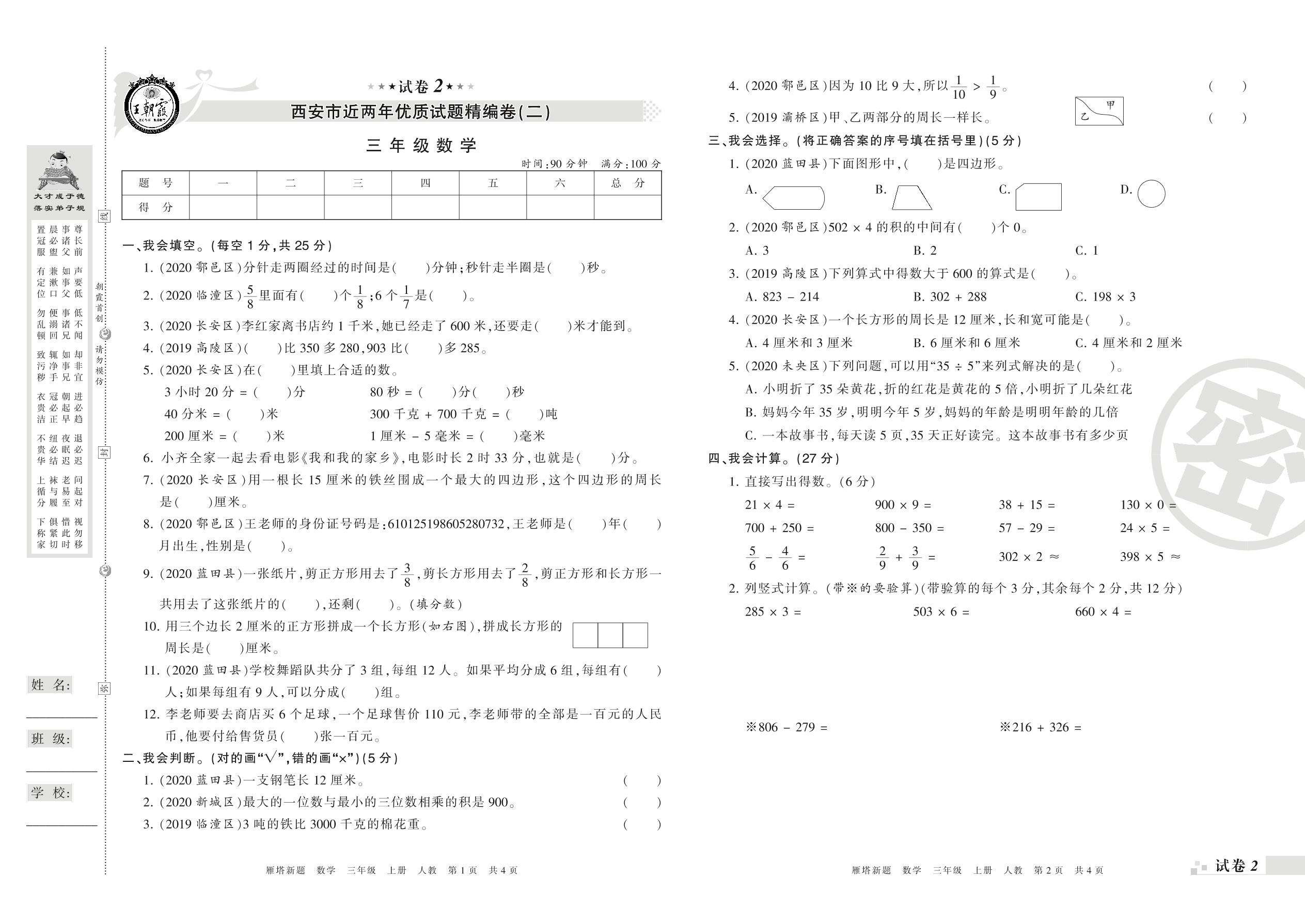 西安市近两年优质试题精编卷(二)三年级上册数学(人教版)【2】