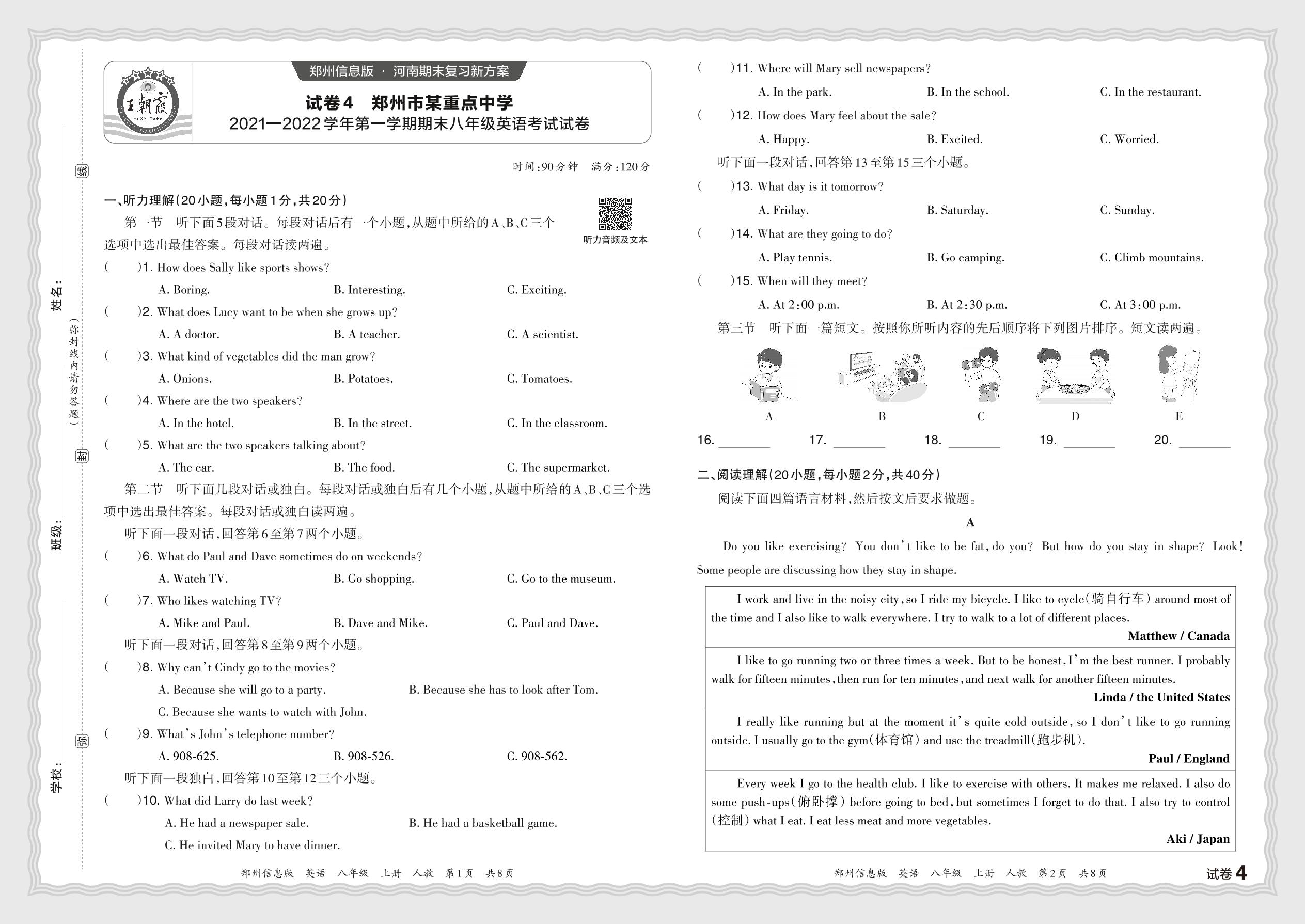 河南省郑州市某重点中学2021—2022 学年第一学期期末八年级英语考试试卷(人教版)【4】
